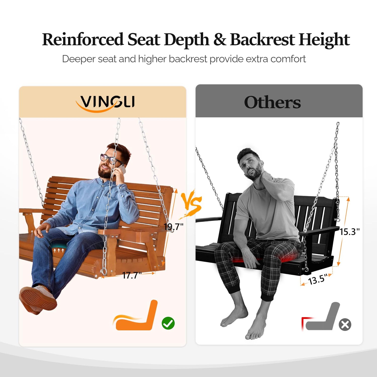 VINGLI XL Size Patio Wooden Porch Swing Outdoor with Cup Holders & Phone Slots, Heavy Duty 880 LBS Hanging Swing Chair Bench with Hanging Chains for Yard, Lawn, Garden (5 FT Pro, Brown)
