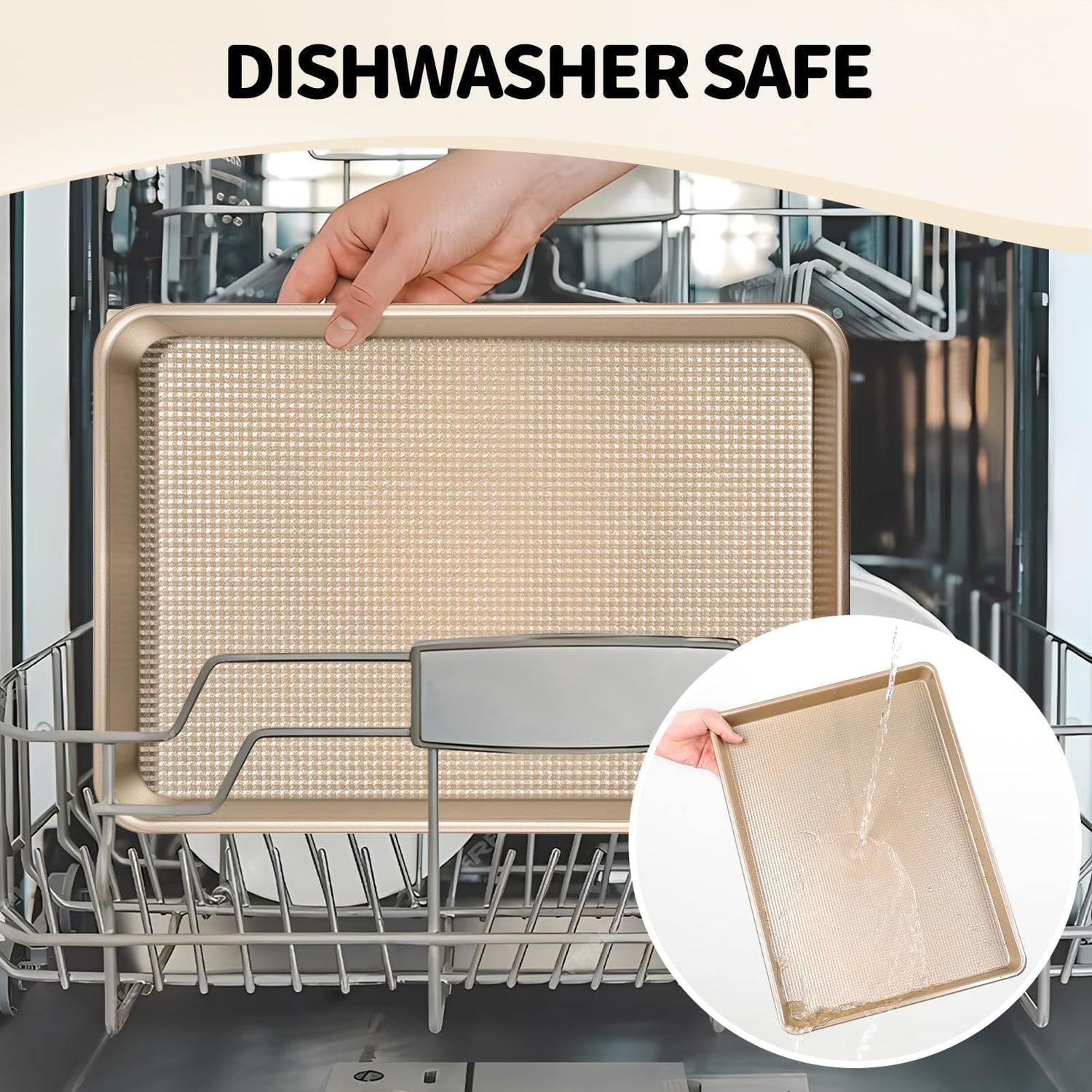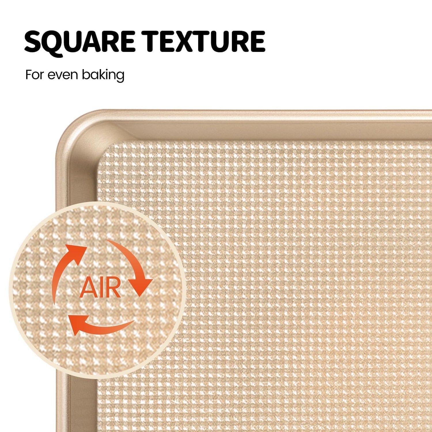 - UNIQUE SQUARE TEXTURE: The cookie sheets for baking feature a unique square texture on the surface that enhances their non-stick functionality and facilitates uniform and swift heat distribution to the cookie. This design ensures that the cookies are baked evenly, eliminating any instances of overcooking or undercooking