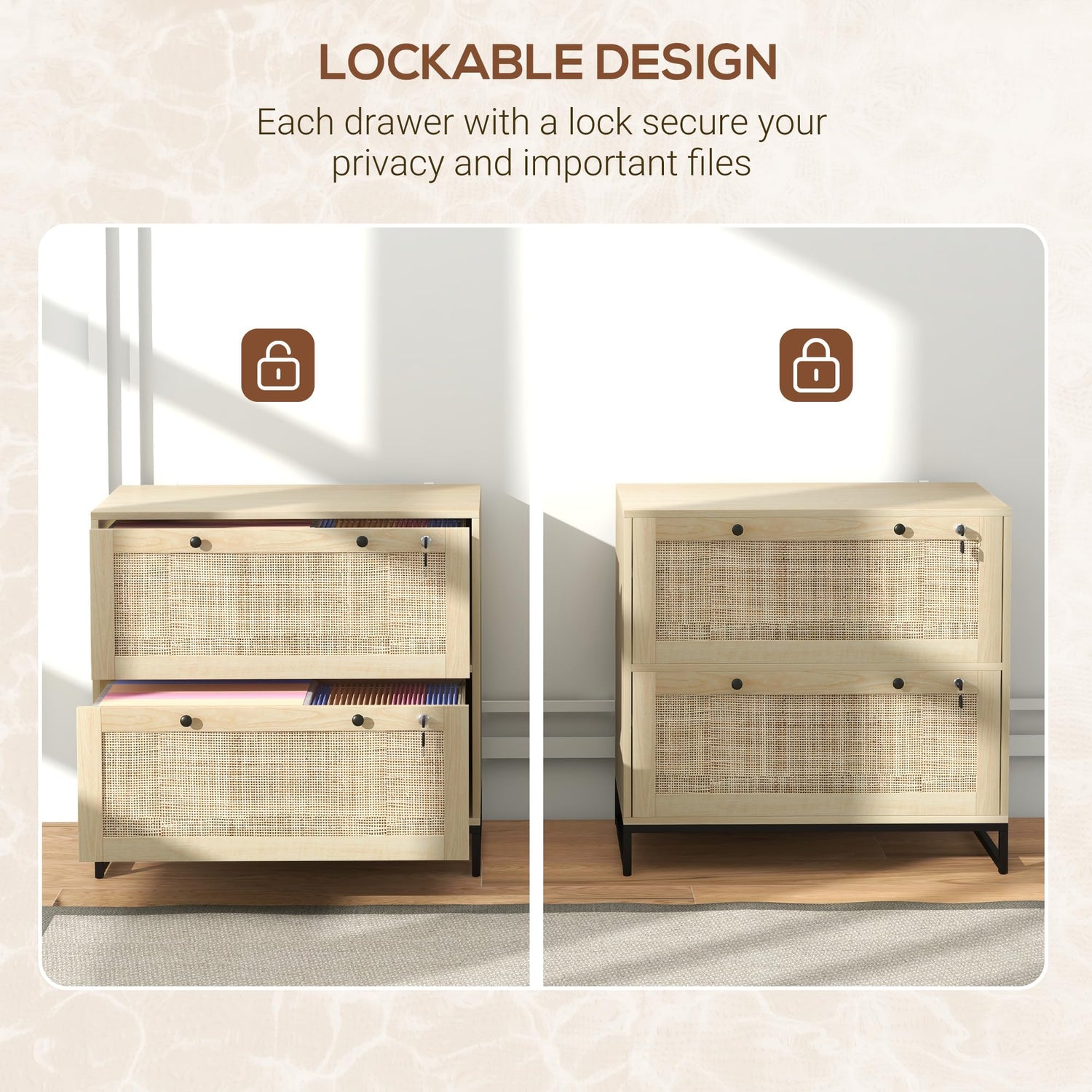 - Boho Style: Our office storage cabinet features rattan panels on its drawers and round alloy handles. Handmade with natural rattan, they add boho charm to your home.