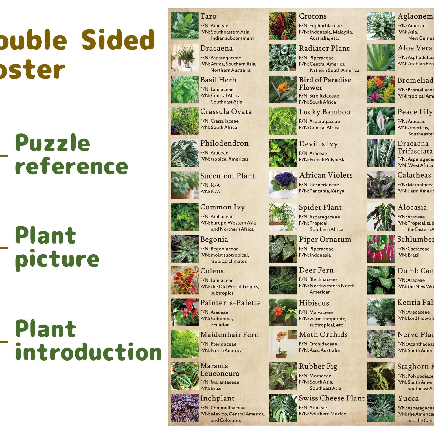 - Double-sided poster: One side of the poster is a copy of the vintage puzzles. Other side is the introduction of the house plants, the good resolution image, common name, family name and native place of the house plants are included