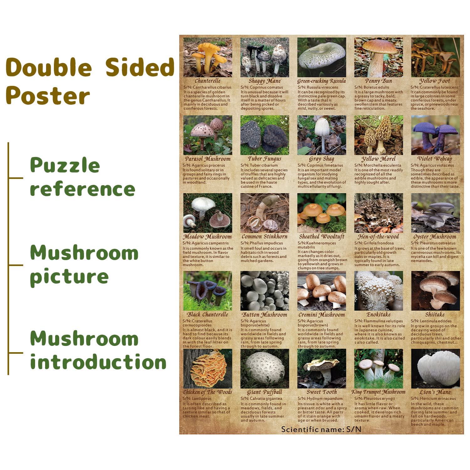 - Double-sided poster: One side of the poster is a copy of the mushroom puzzles for adults. Other side is the introduction of the mushrooms, the clear resolution images, common name and family name are included
