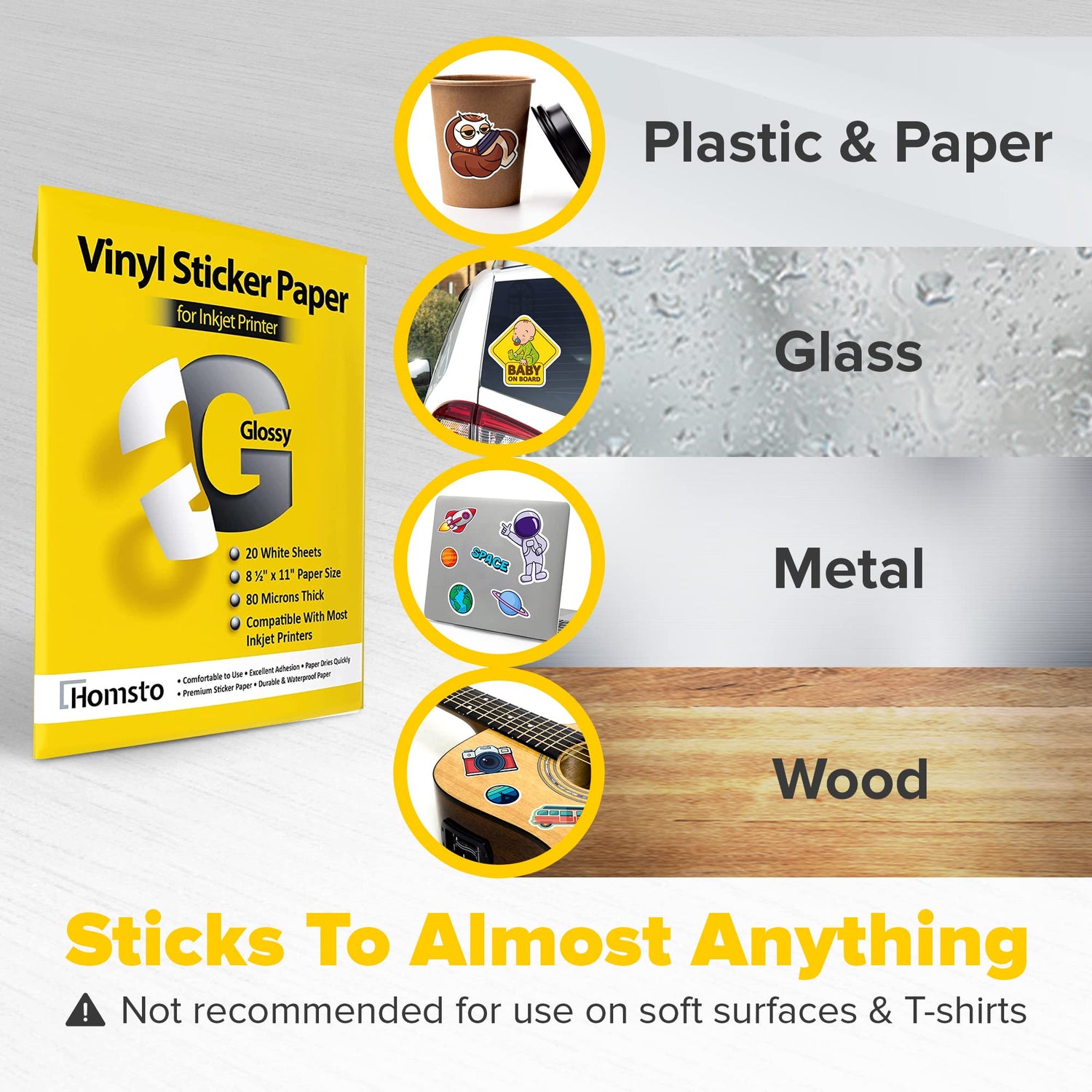 Vinyl Sticker Paper, Glossy Printable Vinyl Sticker Paper for Inkjet Printer, Quick-Drying, Water and Scratch-Resistant, Self-Adhesive for Most Surfaces, 8.5 x 11 Inches, 20 Sheets
