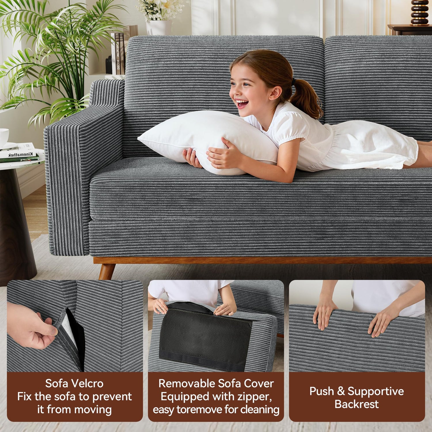 Vipbear 65.4" Loveseat Sofa Grey Corduroy Couch, Mid-Century Modern Small Couches for Living Room, Bedroom, Office, Comfy Sofa with Spring Cushion, Solid Wood Frame, Tool-Free Assembly