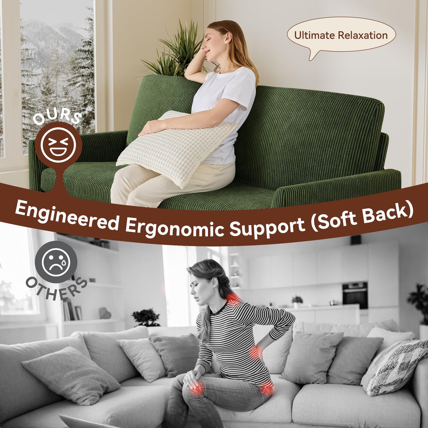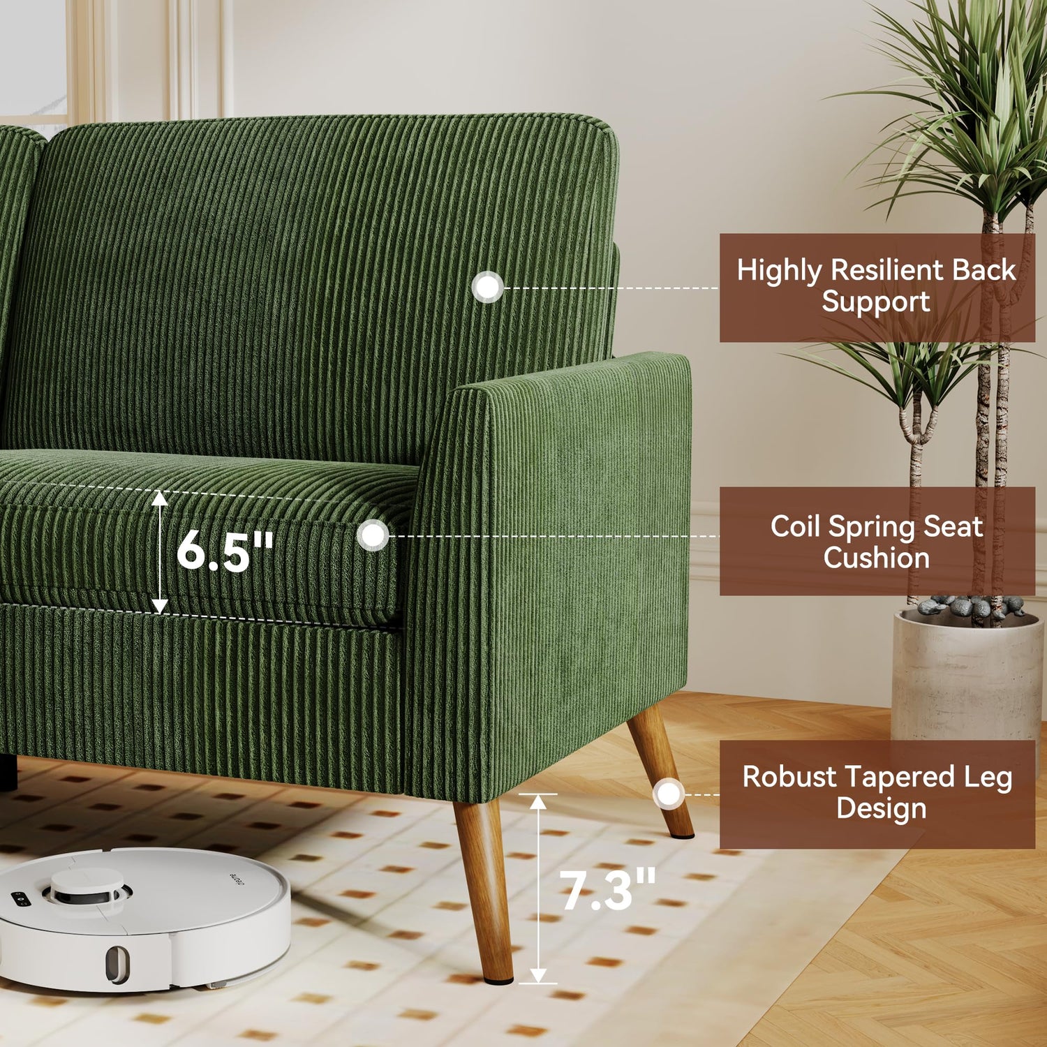 Vipbear 68" Loveseat Sofa - Green, Comfy Corduroy with Spring Cushion, Solid Wood Frame, Modern Deep Seat, Bedroom & Living Room, Office Small Couch