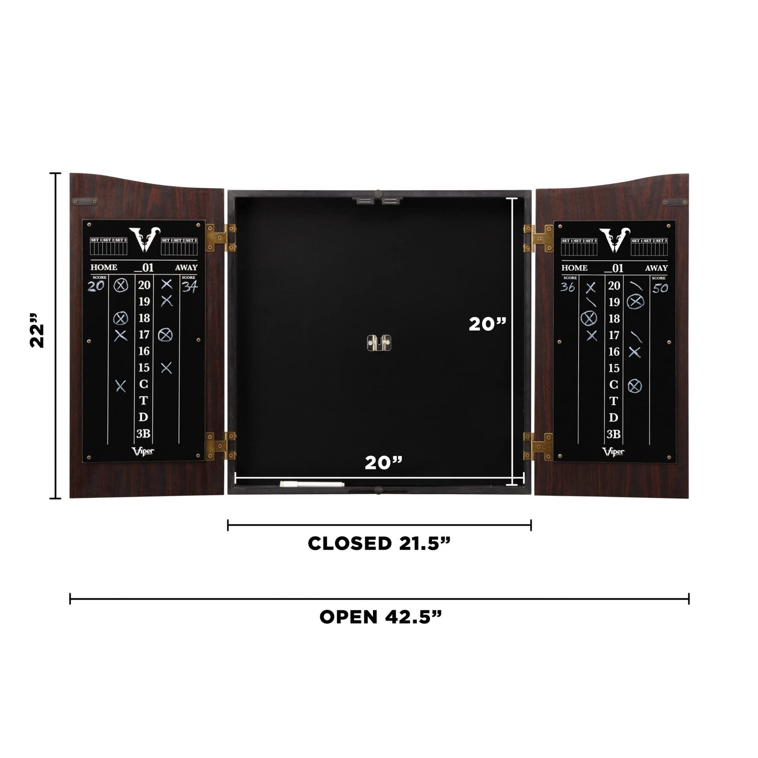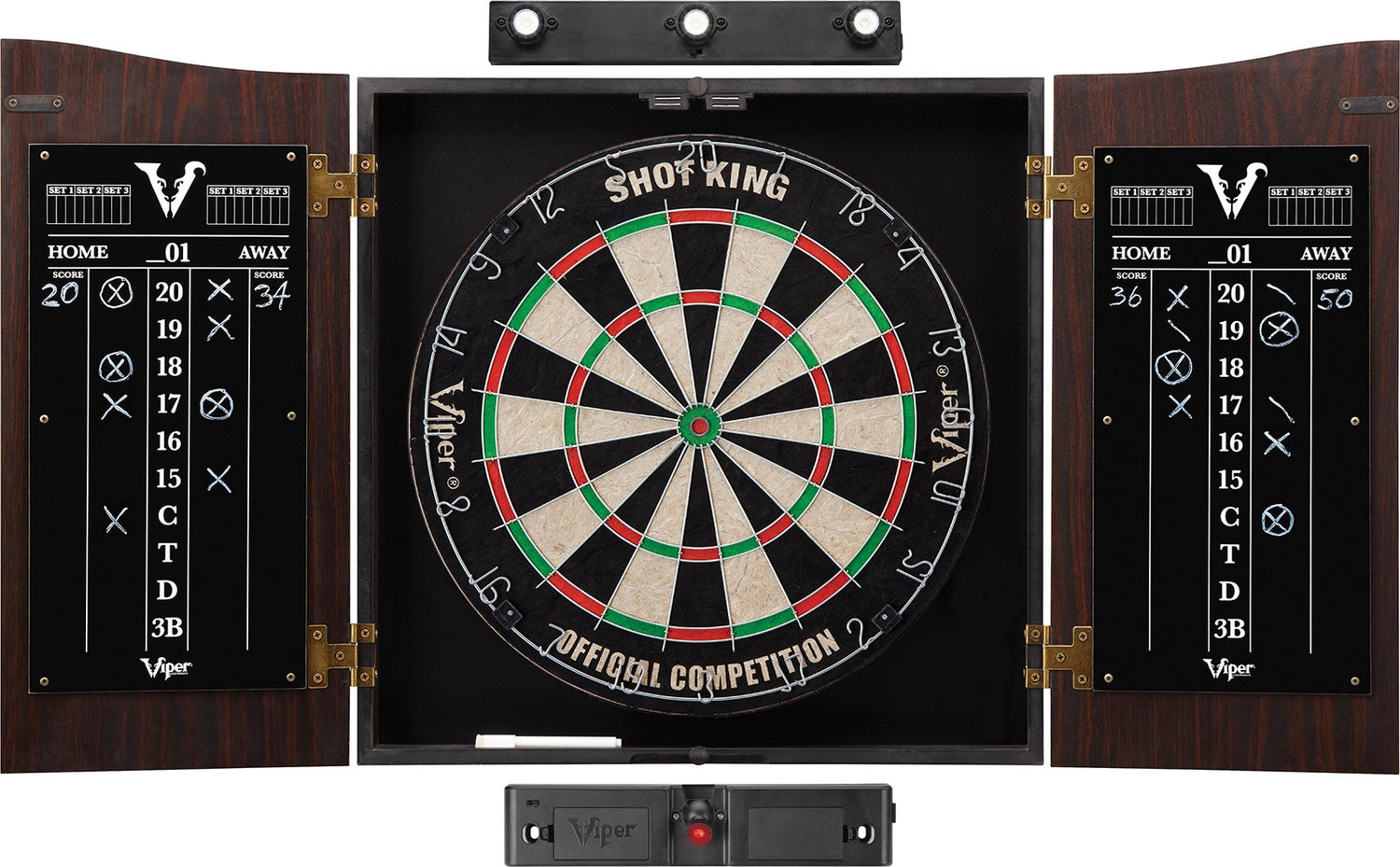 Details: Everything you need to optimize your darting experience is now available in a convenient, comprehensive bundle. Each Viper Vault bundled set contains a dartboard cabinet, a Viper Shot King sisal/bristle staple-free bullseye dartboard, 2 complete sets of steel tip darts (6 total), a dry erase scoreboard, dry erase marker and mounting hardware. The dartboard cabinet features a black felt lining and is fitted with 2 compact door stoppers, which helps protect the dartboard and cabinet from a door slamming shut. Magnets keep the cabinet closed between games. The quality construction provides lasting durability and complements the look of any room. Open dimensions: 42" L x 21.5" W x 3" D; closed dimensions: 21" L x 21.5" W x 3" D. Measuring 18" in diameter and 1.5" D, which is official tournament size, the Viper Shot King dartboard features a staple-free bullseye which greatly reduces bounce outs. It's constructed from sisal/bristle fibers compressed together, providing unsurpassed durability. A movable number ring further extends the dartboard's life. The steel tip darts are designed with high quality, nickel silver plated barrels, which offer exceptional balance and styling in a slim profile. Strategically placed knurling and grooves provide excellent gripping points, enhancing your control. Choose from the Standard, Deluxe, Premium and Elite sets, selecting the bundle that suits your needs. The Standard bundle includes a Viper Edge dart throw/toe line marker. The Deluxe bundle includes a Viper laser throw/toe line marker. The Premium bundle includes a Viper Edge dart throw/toe line marker and a Viper Shadow Buster cabinet mounted display light. The Elite bundle includes a Viper laser throw/toe line marker and a Viper Shadow Buster cabinet mounted display light. COMPONENTS: The Viper Edge dart throw/toe line marker is constructed with high quality printing and heavy duty resin to withstand heavy foot-traffic areas. The Viper laser throw/toe line marker delivers a bright and energy efficient laser beam which allows it to be seen even in intense daylight. The adjustable laser throw/toe line provides a modern alternative to traditional adhesive floor markers. Once the laser is mounted, simply tighten the 2 screws on either side to ensure it stays in place, even if it is bumped. The Viper Shadow Buster cabinet mounted display light illuminates your dartboard, enhancing your visibility and transforming your game room into a true centerpiece. It features 3 adjustable bright and energy efficient LED light pods, delivering a crisp, clear view at any distance.