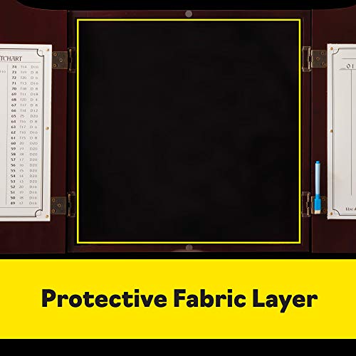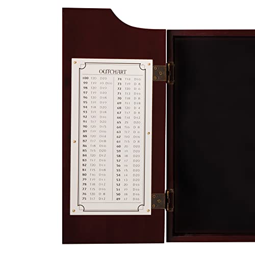 Details: The Viper Hudson dartboard cabinet features a black felt lining and is available in a rich mahogany finish. Crafted with solid pine, box joints and bronze hinges, this cabinet's quality construction provides lasting durability and complements the look of any room. It's fitted with 2 compact door stoppers which help protect the dartboard and cabinet from a door slamming shut. Open dimensions: 41.5" L x 21.25" W x 3.5" D; closed dimensions: 23.25" L x 21.25" W x 3.5 D. The main compartment measures 20" L x 20" W x 2.125" D, which accommodates all official tournament sized sisal/bristle dartboards (18" in diameter). Includes a dry erase scoreboard, out-chart board, dry erase marker and mounting hardware. Dartboard and accessories sold separately.