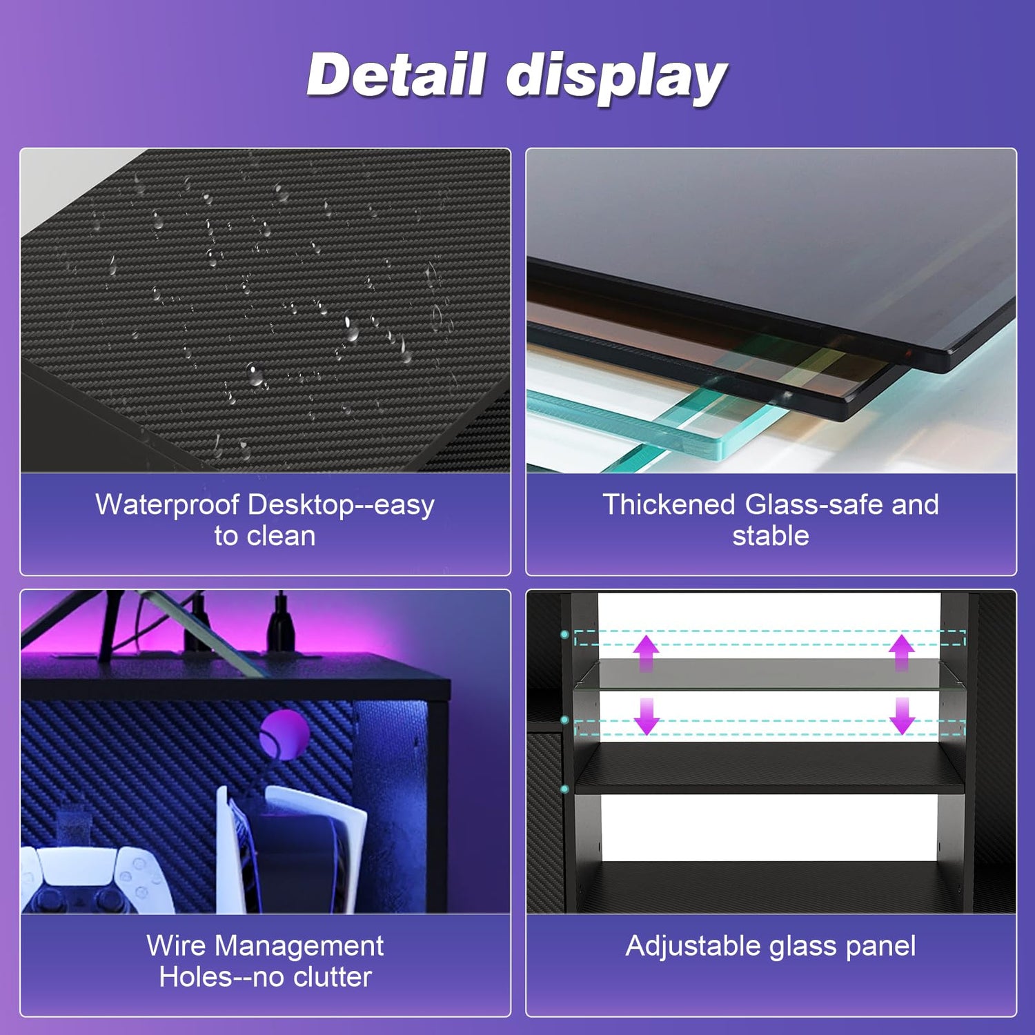 - Unique Design; 3D carbon fiber surface, making your space more beautiful. The cable management hole can organize and hide unsightly wires. The glass shelf can be adjusted up and down according to your needs, changing the size of the space for things