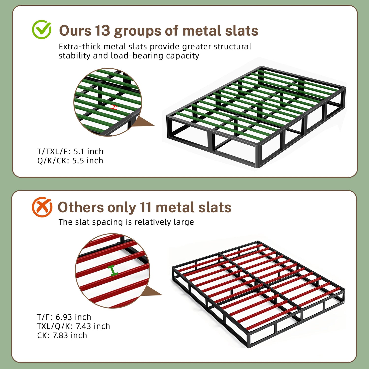 • Noise-Free Design: This low-profile bed frame has soundproof cotton between the slats, effectively reducing friction between the steel frame and preventing annoying squeaking noises during movements.