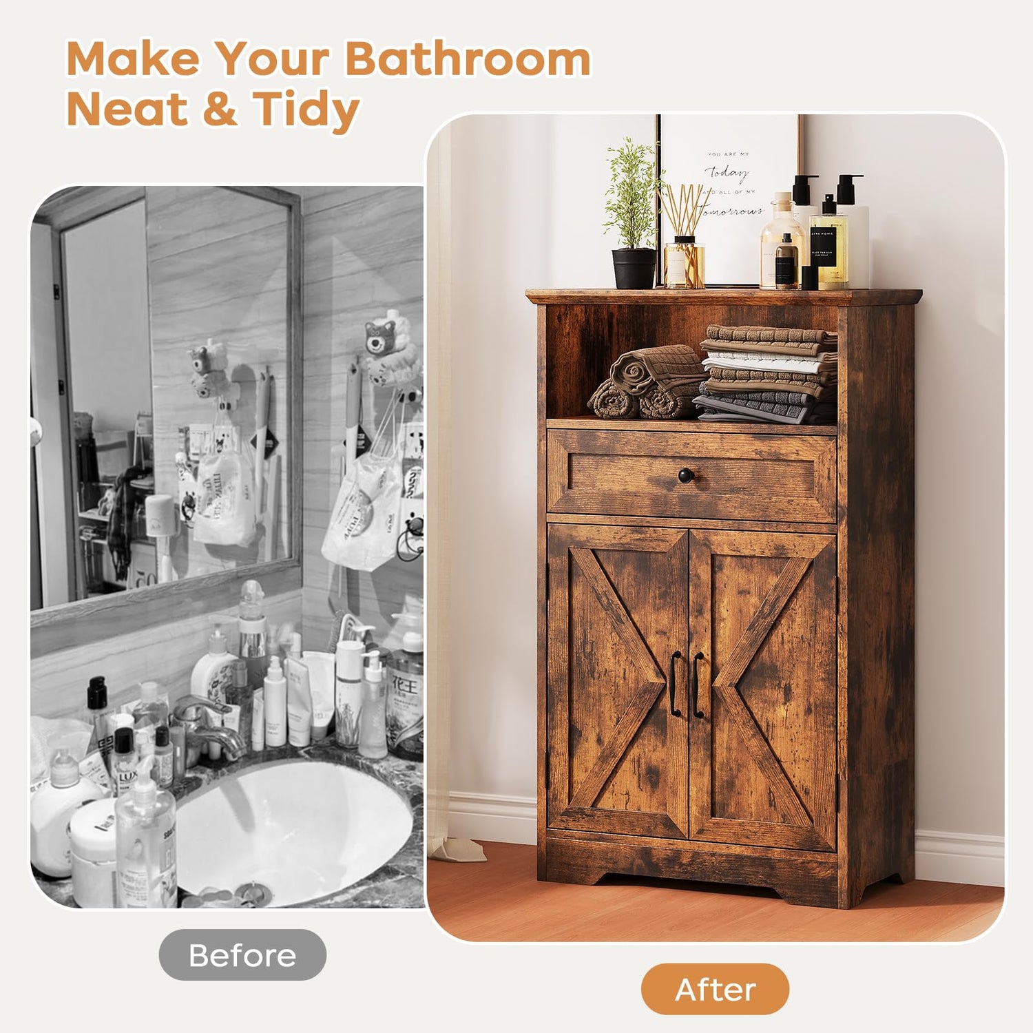 Viroformo Floor Cabinet, Farmhouse Storage Cabinet with Barn Doors and Drawer, 11.81" D x 23.62" W x 39.37" H Rustic Brown Freestanding Adjustable Shelf Organizer for Bathroom, Kitchen, Living Room