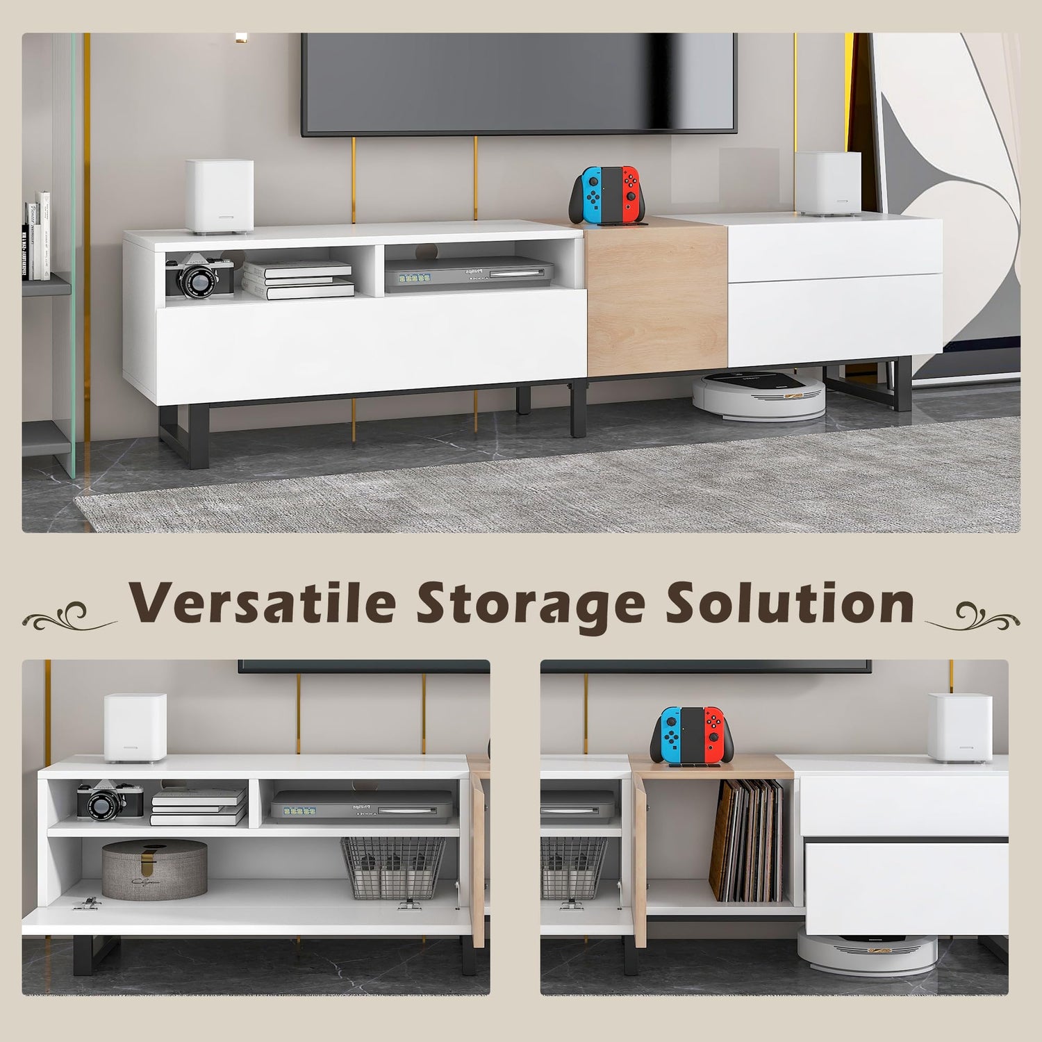 - Ample Storage Space: The generous TV stand features 3 hidden storage spaces and 1 functional open shelf, which can accommodate all your storage needs such as CDs, DVDs, media players, remotes, board games and seasonal decorations.