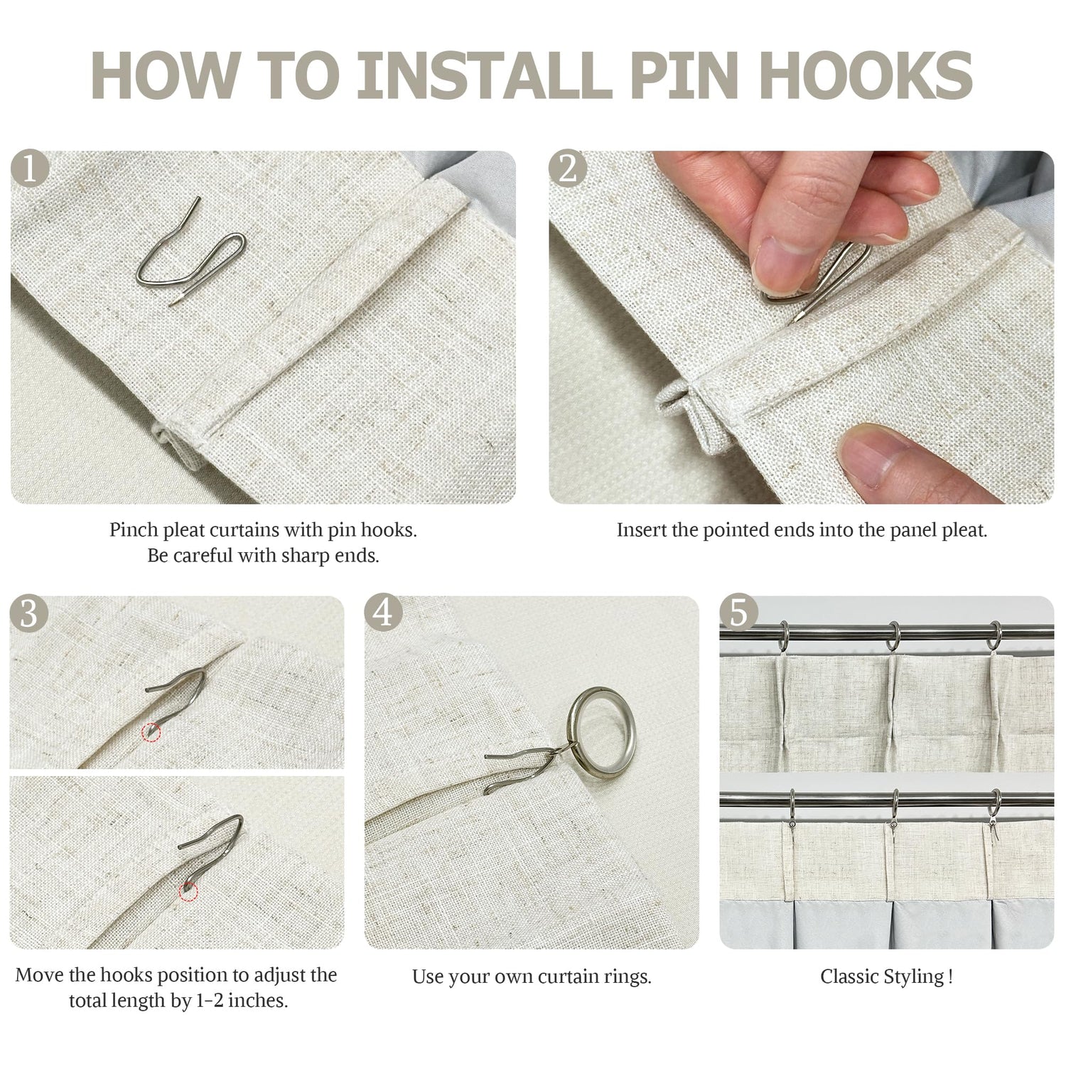 - Multiple Hanging Ways:The luxury curtain have many hanging options to meet your different home décor needs:back tabs(4 inch),clip rings,ring hooks or for track system. Please note that 18 hooks are in the package but clips and rings are not included.Two weighted hems sewn at bottem increase the draping effect.Moving the pinhooks position to adjust the total height by 1-2 inches