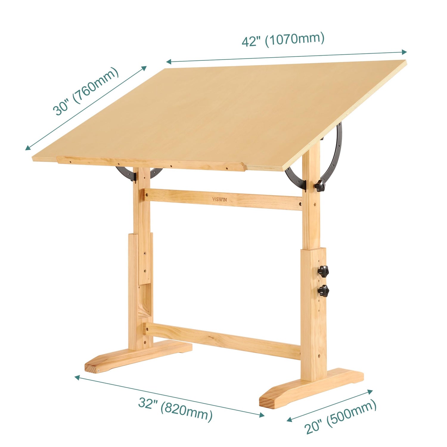 VISWIN 30" x 42" Extra-Large Artist Drafting Table, Adjustable Height & Angle, Solid Pine Wood Drawing Table, Art Table for Adults, Tilts Flat, Craft Table for Painting, Writing, Reading