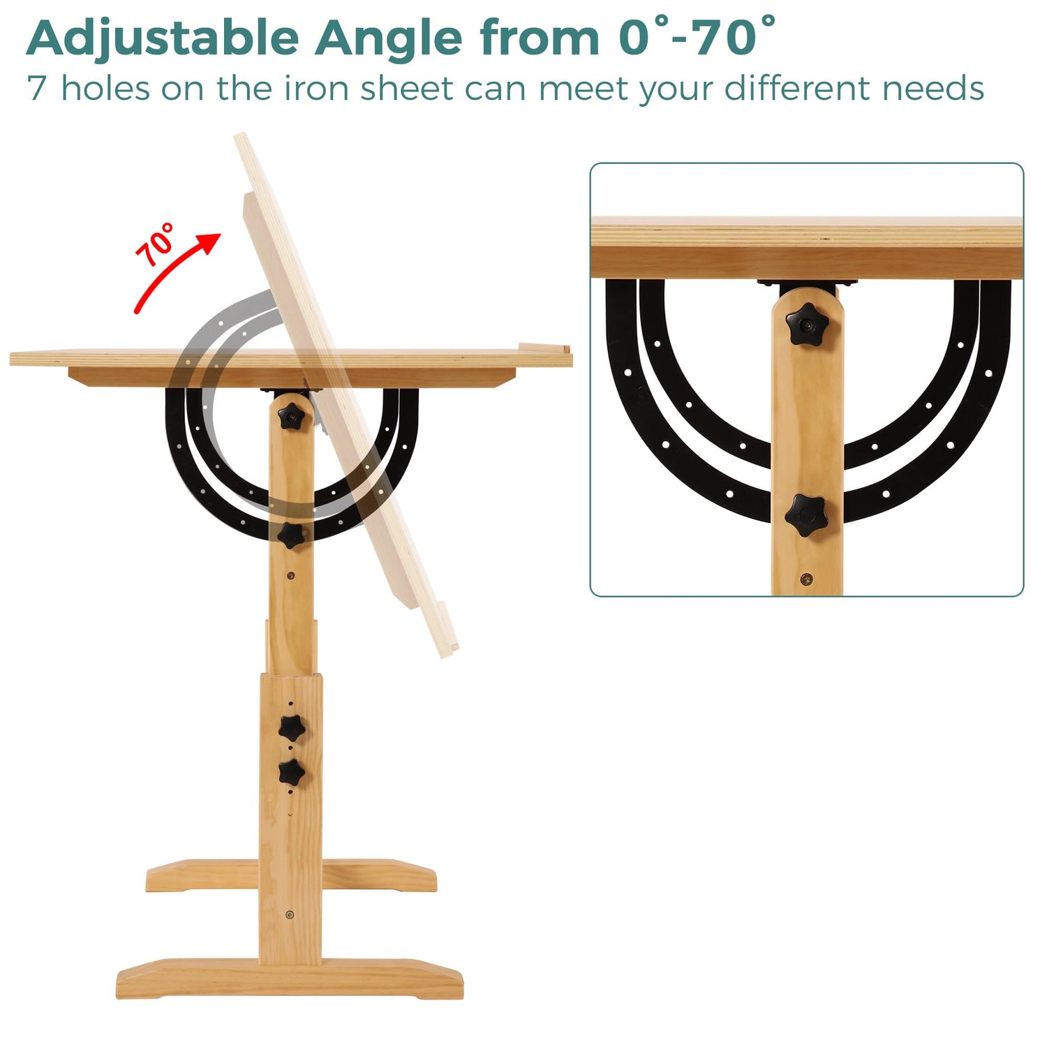 - [Stable and Sturdy Construction] Our wooden drafting table is made from premium New Zealand pine wood without burrs or sharp edges, ensuring stability during your artistic endeavors. The natural grain and warm tones of pine wood create an inviting and inspiring workspace. Widened trapezoidal base and the second rod provide double stability for the table. The thick wooden table legs are stable and strong. Don't hesitate! Let your artistic dreams soar with us!