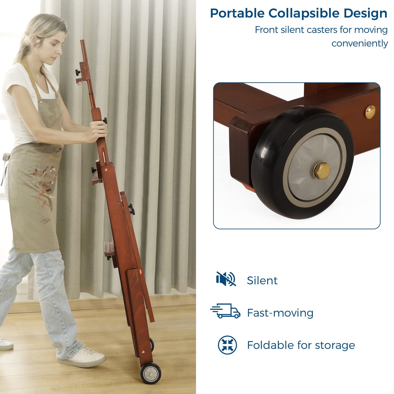 - [Silent Front Casters] The solid base size is 19" x 21", relying on 2 front silent rolling wheels, making movement a snap. It provides a large range in height adjustability(59"-95" high). The maximum loading capacity is 33 lbs (15kg). It is effortless to move even for such a little heavier easel(24 lbs-11kg). The stable & compact structure and silent casters make it without any harsh noises during the creation and movement.