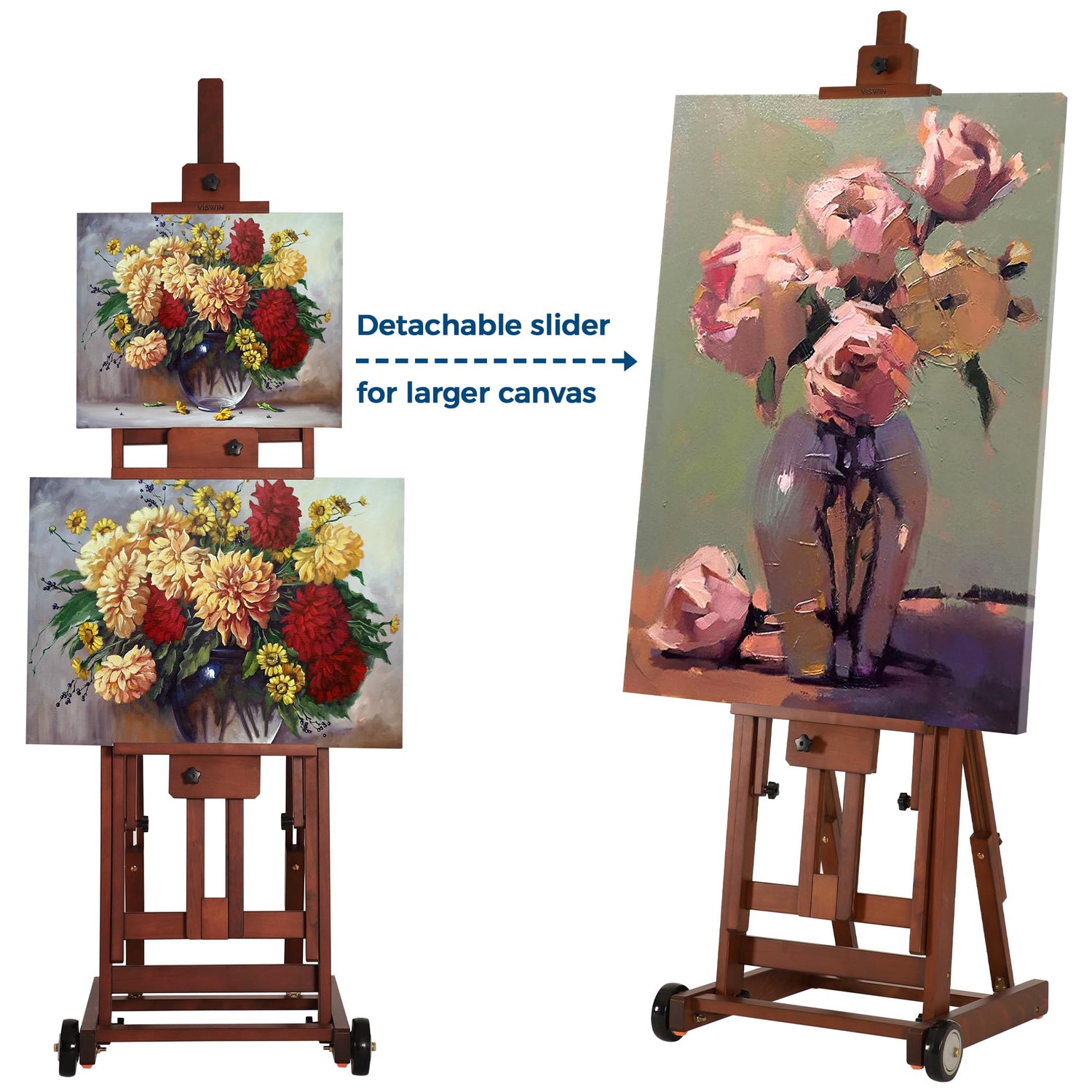 - [All-Purpose Easel] Elegant single mast design contains three sliders, which allow you to adjust the easel easily to any size of the canvas art, accommodating canvases up to 78 inches. Two canvases can be placed to help you better refer to artworks and copy paintings, attracting some art students who are vexed at art class homework. It is also ideal for oil, watercolor, pastel, airbrush, or acrylic artists.