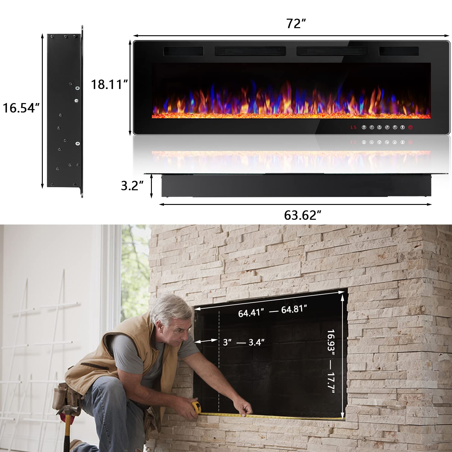 - Multi Install Methods: This electric fireplace not only can be recessed or semi recessed in wall, but also can be wall mounted, perfect fit for 2’ X 6’ stud wall. Product Size 72"Wx18.11’’Hx3.2"D. The thickness of the upgraded electric fireplace is reduced to 3.2 inch and won’t be obtrusive on the wall. It can be installed in the living room or bedroom, but it needs to be kept away from other appliances
