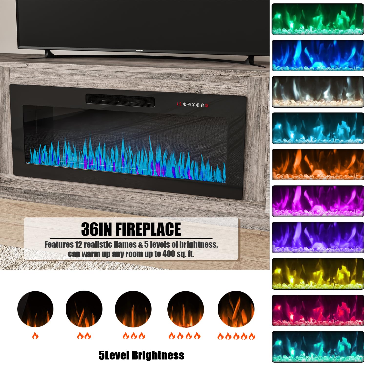 - [TV Stand with Electric Fireplace] :Adopting a 2-in-1 design, combining the TV Stand with the electric fireplace. TV cabinet for TVs up to 90”, and the desktop can bear up to 300 pounds. It comes with a 36-inch electric fireplace,can heat up to a 400-square-foot room, adjustable between 750 watts and 1,500 watts. Make the TV placement more stable and provide a better viewing experience. The electric fireplace has 12 types of flames, and the speed and brightness of 5 types of flames can be adjusted, allowing you to customize various atmospheres.