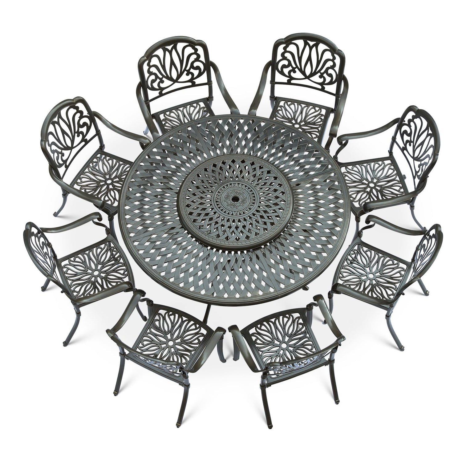 - 【9 Piece Dining Sets】This 9-Piece Dining Set includes 8 chairs and 61" round dining table with 31" lazy susan. Elegant cast accents scroll across the chairs and table top, adding a level of sophistication and craftsmanship to the collection. Perfect addition to your patio, yard, deck, or porch.