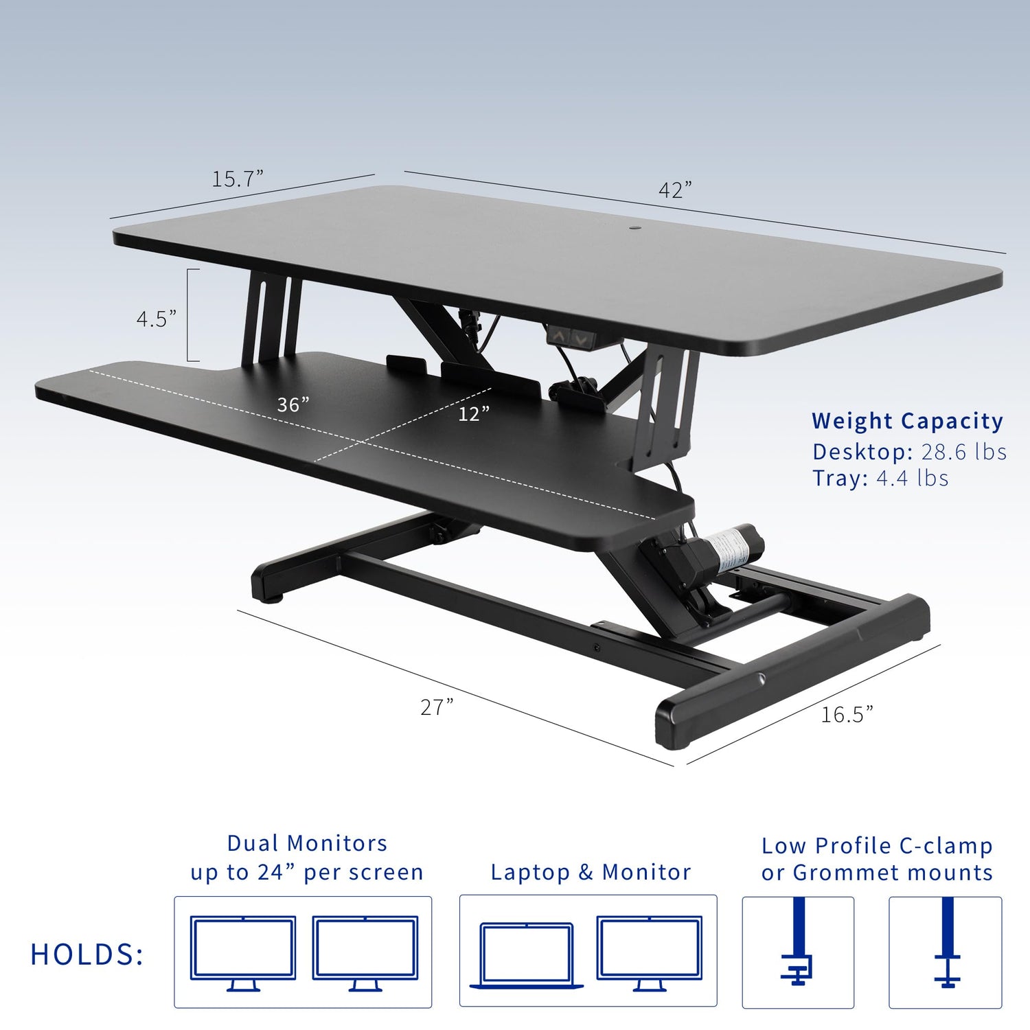 - Spacious 42” Surface - The top surface measures 42” x 15.7”, providing plenty of room for dual monitor and laptop setups. The 36” x 12” keyboard tray raises in sync with the top surface to create a comfortable workstation. Minimalist look blends well with most modern office decor.