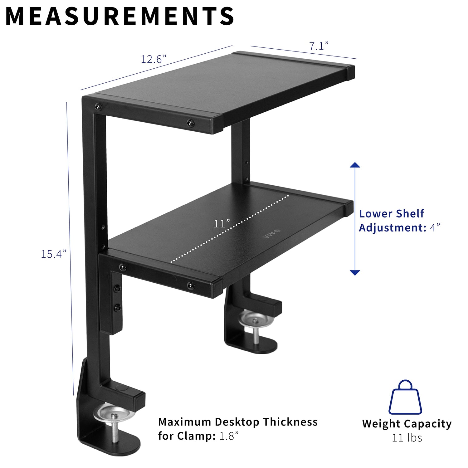- Clamp-on Dual Shelf - Unique clamp design allows this 2-tier shelving unit to be installed above or below the desktop, adding extra storage to your workstation. Solid 12.6” x 7.1” shelves are great for storing gaming devices, office supplies, notebooks, and more. Also great for displaying photos, decor, plants, etc. --Patent Pending--