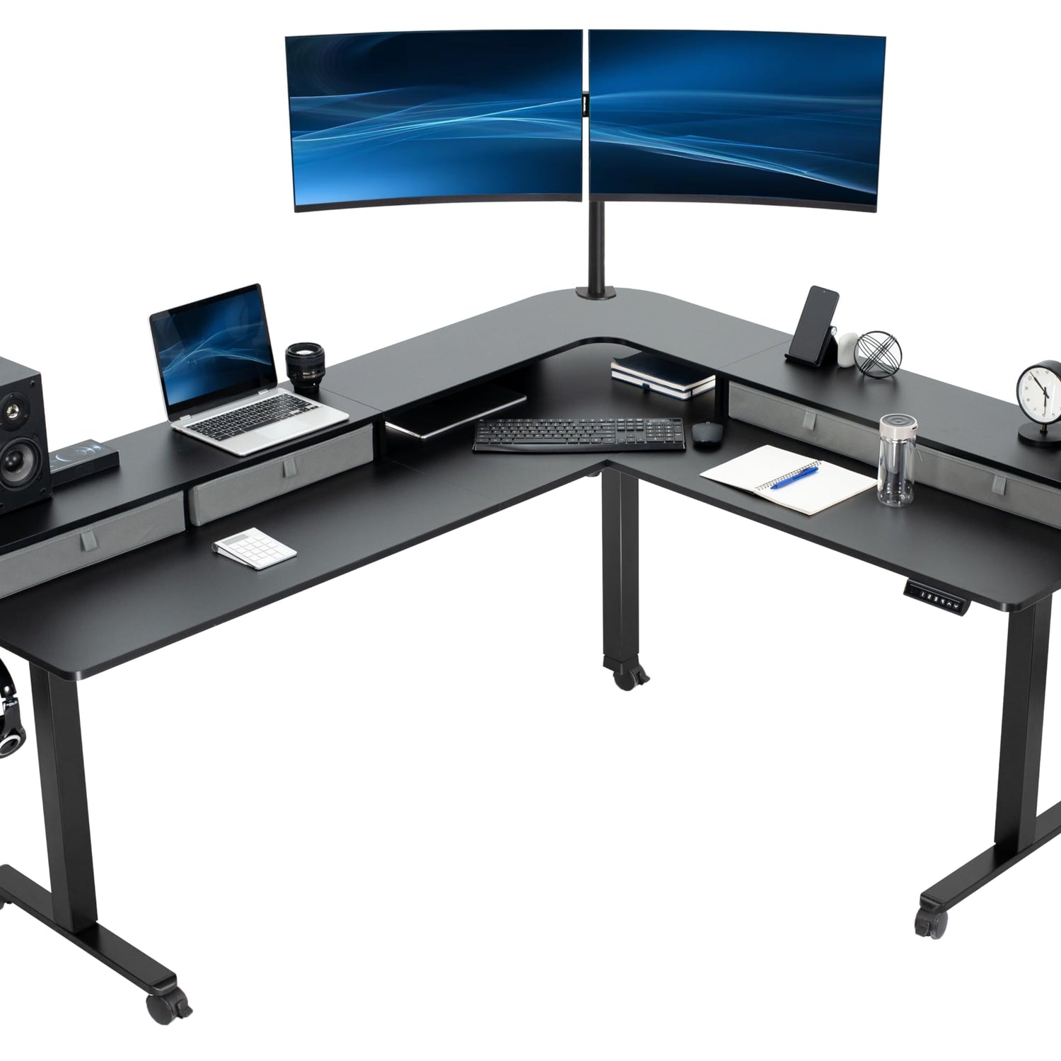- L-Shaped 2-Tier Mobile Workstation - Customize your setup with an innovative 2-tier corner standing desk on wheels. Place your monitors on the top tier for ergonomic viewing and enjoy storage space between the 2 levels. The main, 3-part desktop measures 75” x 63” x 23.5” for a spacious layout.
