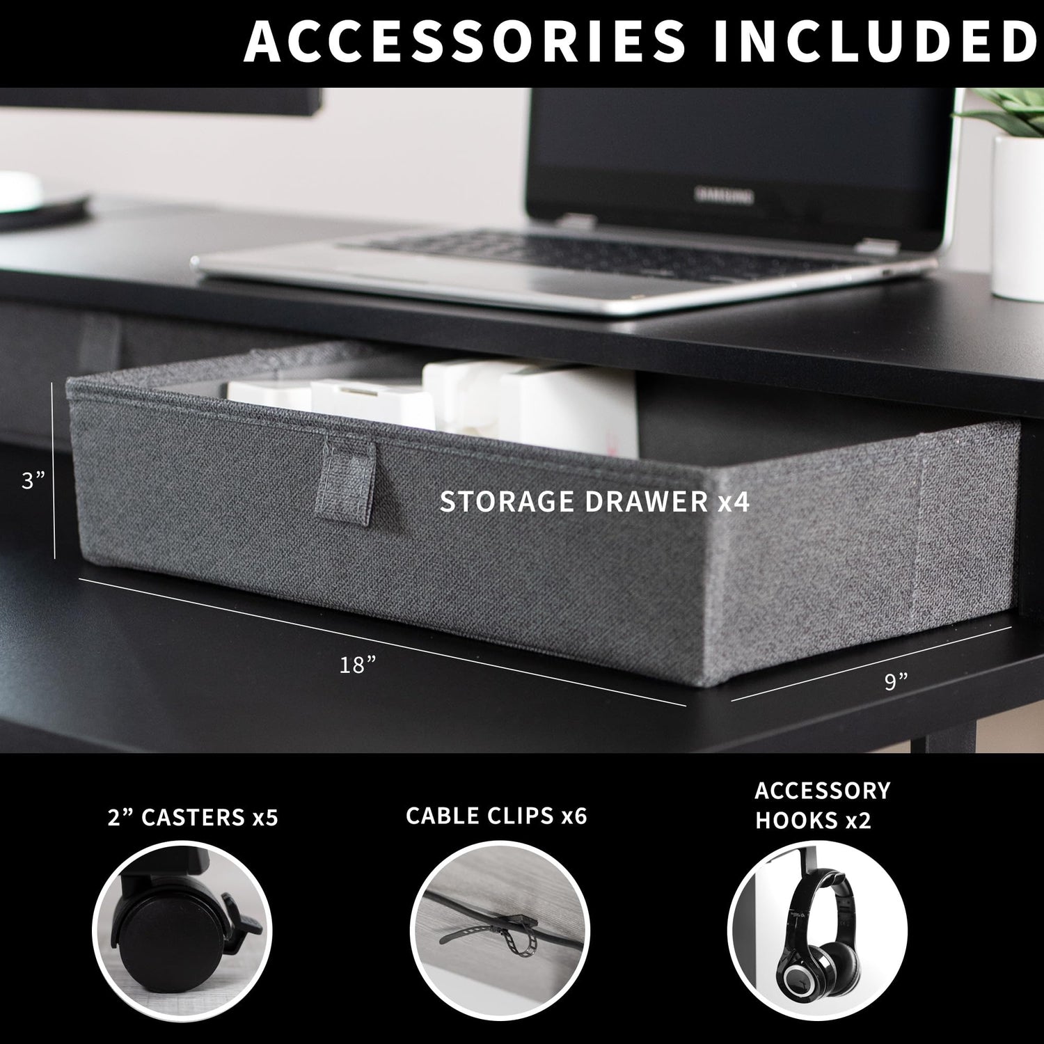 Details: Enjoy an active work life with the Black 2 Tier 75" x 63" Corner Electric Desk with Storage (DESK-E3CVB-75) from VIVO! The innovative 2-tier design will change the way you work, with a spacious layout and convenient storage. Set the main desktop at your preferred typing height, and place your monitors on the top surface for ergonomic screen viewing. Finding a healthy balance between sitting and standing throughout the long work day is made possible with an electric motor, telescopic legs, and a simple push-button memory controller. Durable casters provide smooth mobility on a variety of floor types and are lockable when you want your corner desk to be stationary. All hardware and instructions are provided, so you can get your new active workstation assembled and taking you to new heights!