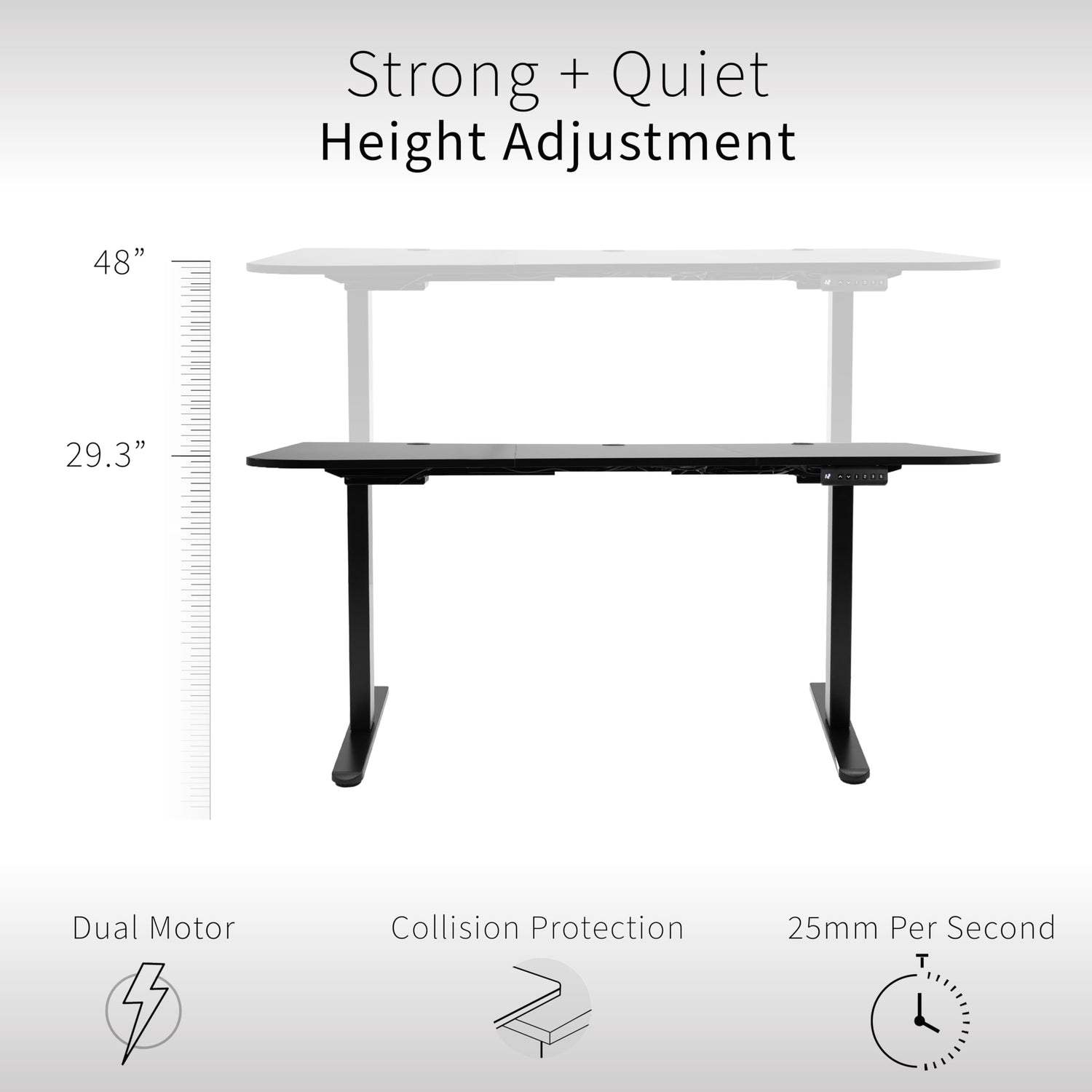 - Powerful Electric Motors - Enjoy a height range of 29.3” to 48” with this frame’s powerful dual motor lift system and strong legs using telescopic height adjustment. The easy-to-use push-button controller features 3 memory presets to save your desired heights.