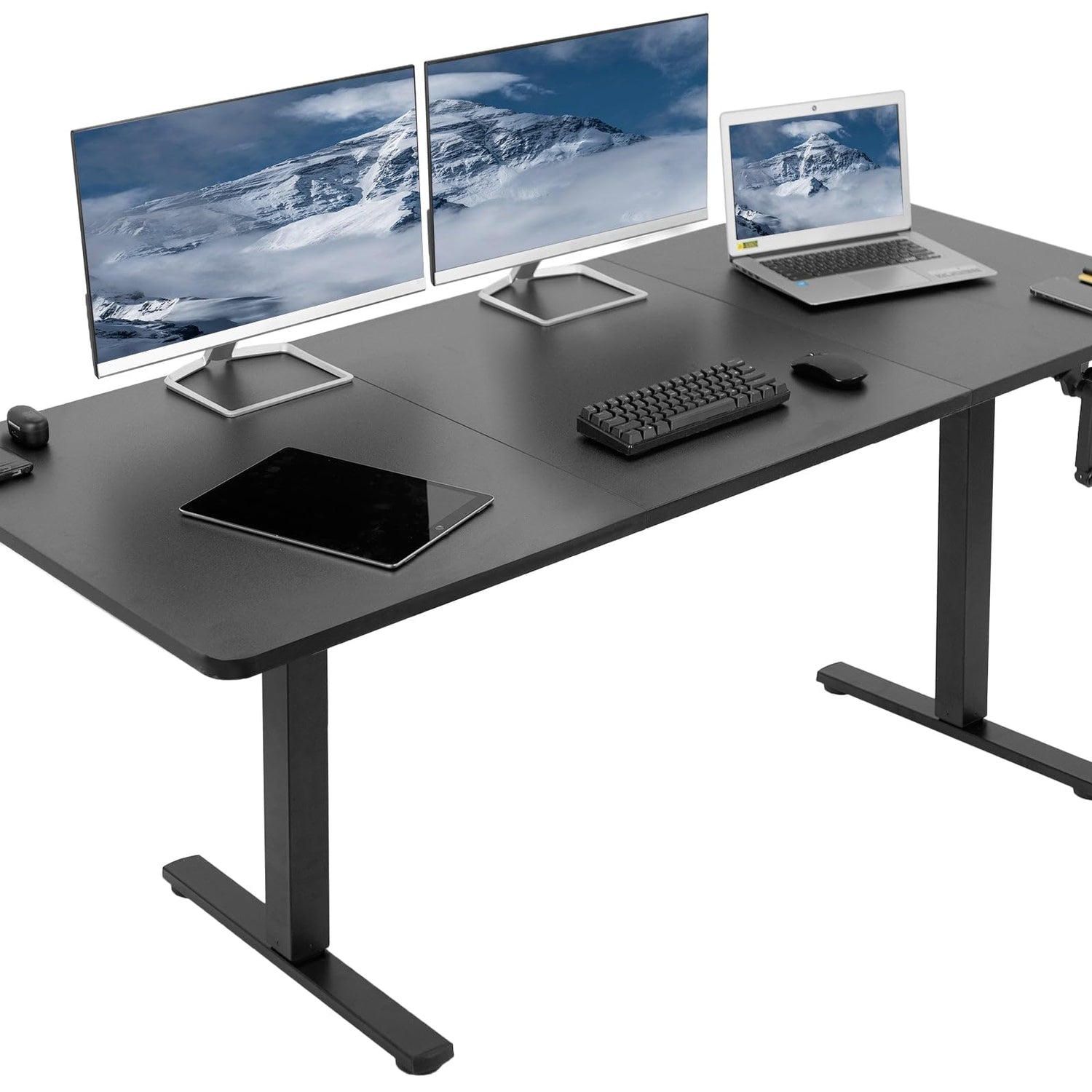 Details: Transform your workstation to accommodate an active work life with the Black 71" x 30" Manual Height Adjustable Desk (DESK-KIT-MB7B) from VIVO! Finding a healthy balance between sitting and standing throughout the long work day is made possible with manual height adjustment, telescopic legs, and an easy-to-use hand crank. The sturdy table top provides room for dual monitor setups and important supplies so you can organize your workspace to fit your preferred layout. With a frame constructed of solid steel, this desk easily supports up to 154 lbs and is built to last. All necessary hardware and instructions are provided, so you can get your new workstation assembled and taking your processes to new heights! PLEASE NOTE: This product ships in 2 separate boxes that may not arrive at the same time, and each package contains a helpful instruction guide.