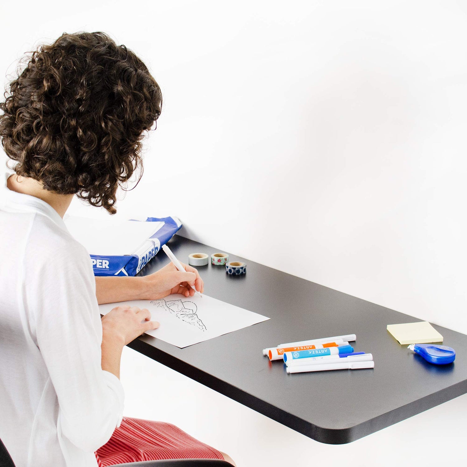 Details: Win back valuable space while experiencing a comfortable work angle with the Black Wall Mounted 43" Folding Workbench (MOUNT-SF1FB) from VIVO! It's easy for work environments to become cluttered with supplies, so this platform was designed with space efficiency in mind. The table top measures 43.3" x 18" and is large enough to hold a wide range of materials, but small enough to not take up your valuable space. Sturdy steel brackets and a durable particle board surface support up to 90 lbs of weight and ensure this product will last a long time. In addition to its versatility, the mount can be folded up with minimal effort when not in use. All necessary hardware and instructions are included so you can get your new workstation assembled and saving storage space in no time!