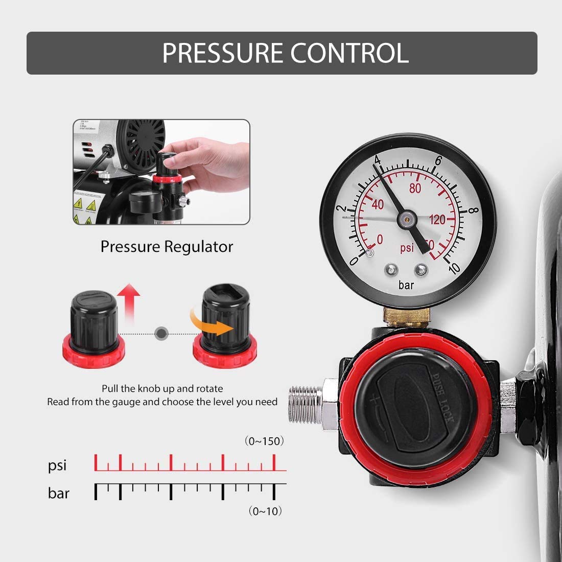 - POWERFUL COMPRESSOR - 1/5HP high-performance, oil-free piston air compressor delivers 23-25L/min air flow; Equipped with an air tank to provide smooth air flow and ensure zero pulse while in operation; Designed for quiet operation, with only 47 dB of noise