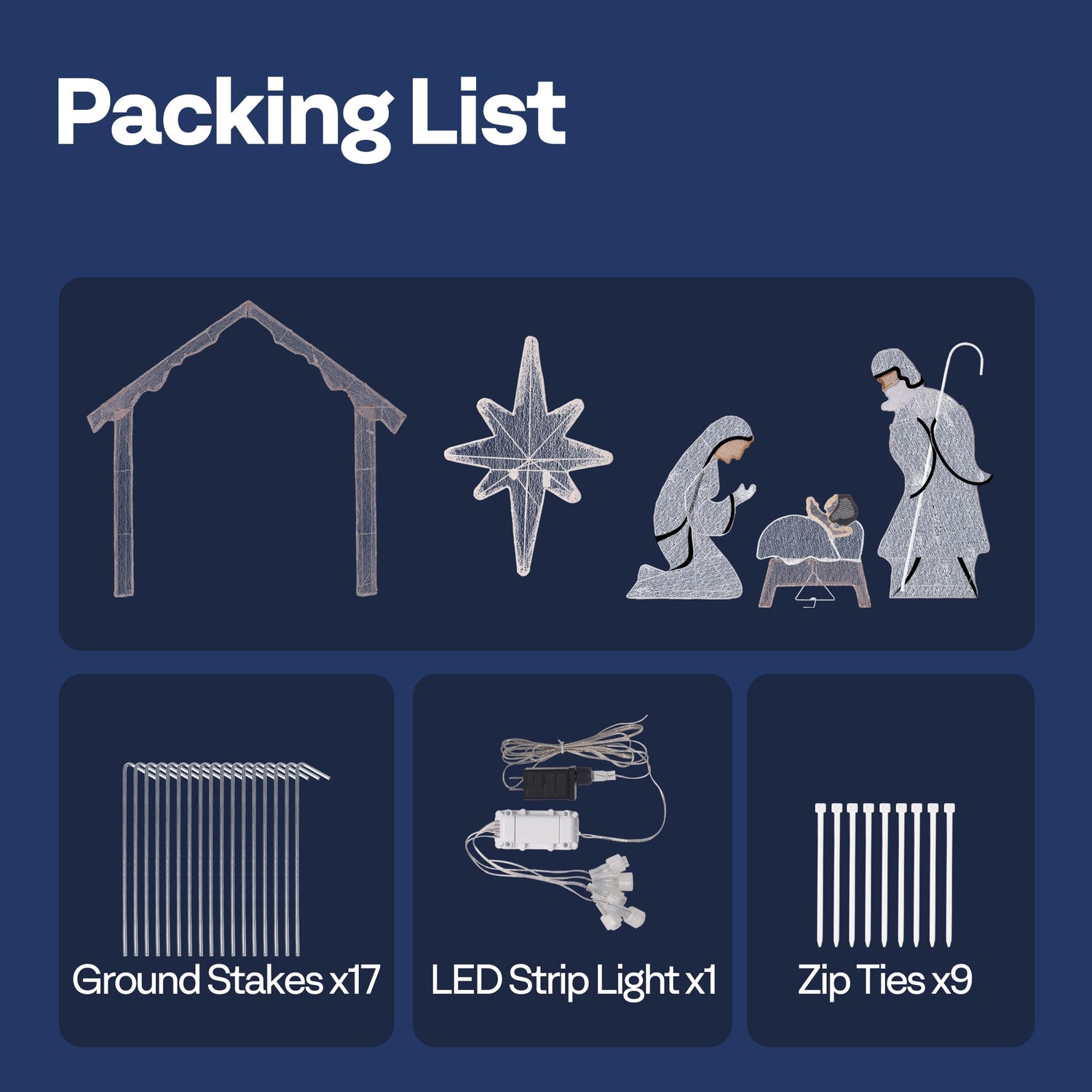 - PACKING LIST: The VIVOHOME 6ft nativity scene comes with everything you need for a stunning display: 9 × Figure Frame Parts for a vivid scene, 2 × Support Metal Frame to reinforce the entire structure, and 1 × LED Strip Light featuring 242 LED lights to brighten the scene and create a warm ambiance; 9 × Zip Ties securely connect the thread and metal frames, while 17 × Ground Stakes ensure the nativity scene is firmly anchored in place