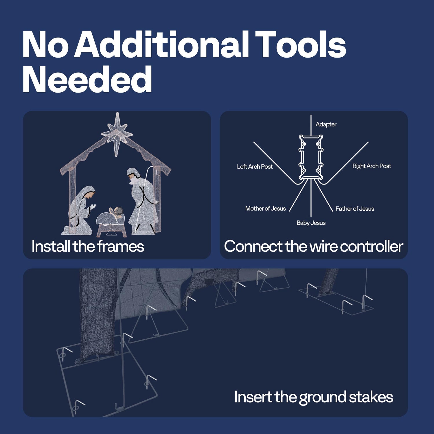 - NO ADDITIONAL TOOLS NEEDED: This 6ft Lighted Nativity Scene requires no additional tools for assembly; Connect the thread frame and metal pieces using the 9 included zip ties; Secure the display to the ground with the 17 stakes provided, then illuminate the scene for a festive touch; When the holidays are over, it folds compactly for easy storage; Enjoy this beautifully lit nativity scene that adds warmth and charm to your holiday décor