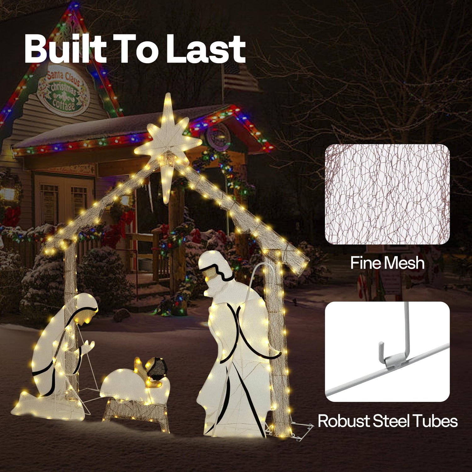 - BUILT TO LAST: Supported by a sturdy powder-coated steel frame, this Nativity scene is well-suited for outdoor conditions; The vibrant thread-framed figurines not only bring the Nativity to life but are also made to resist fading, so your display will stay bright and beautiful; Include 17 metal stakes for secure anchoring and 9 zip ties to firm pieces in place, providing extra stability against wind and other elements