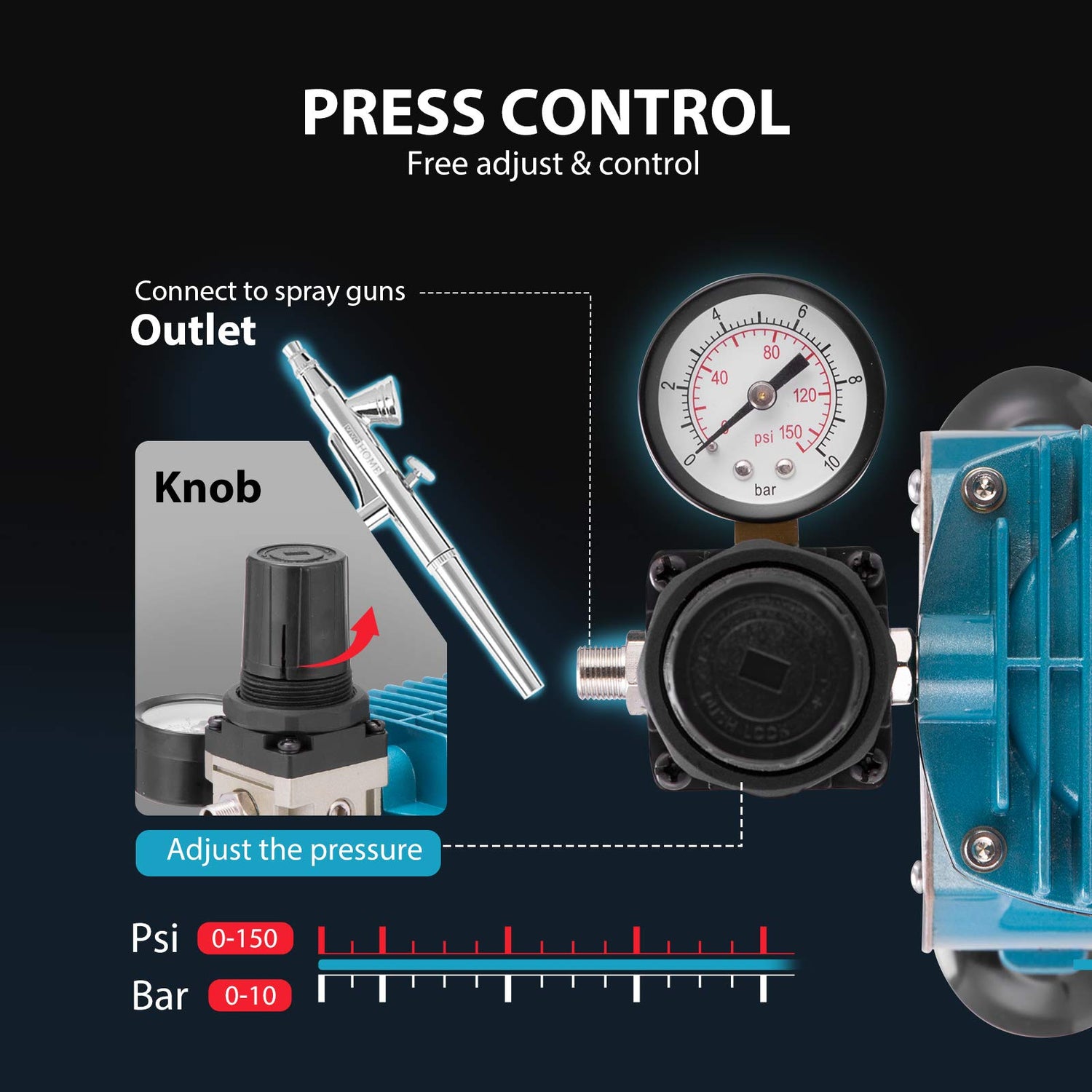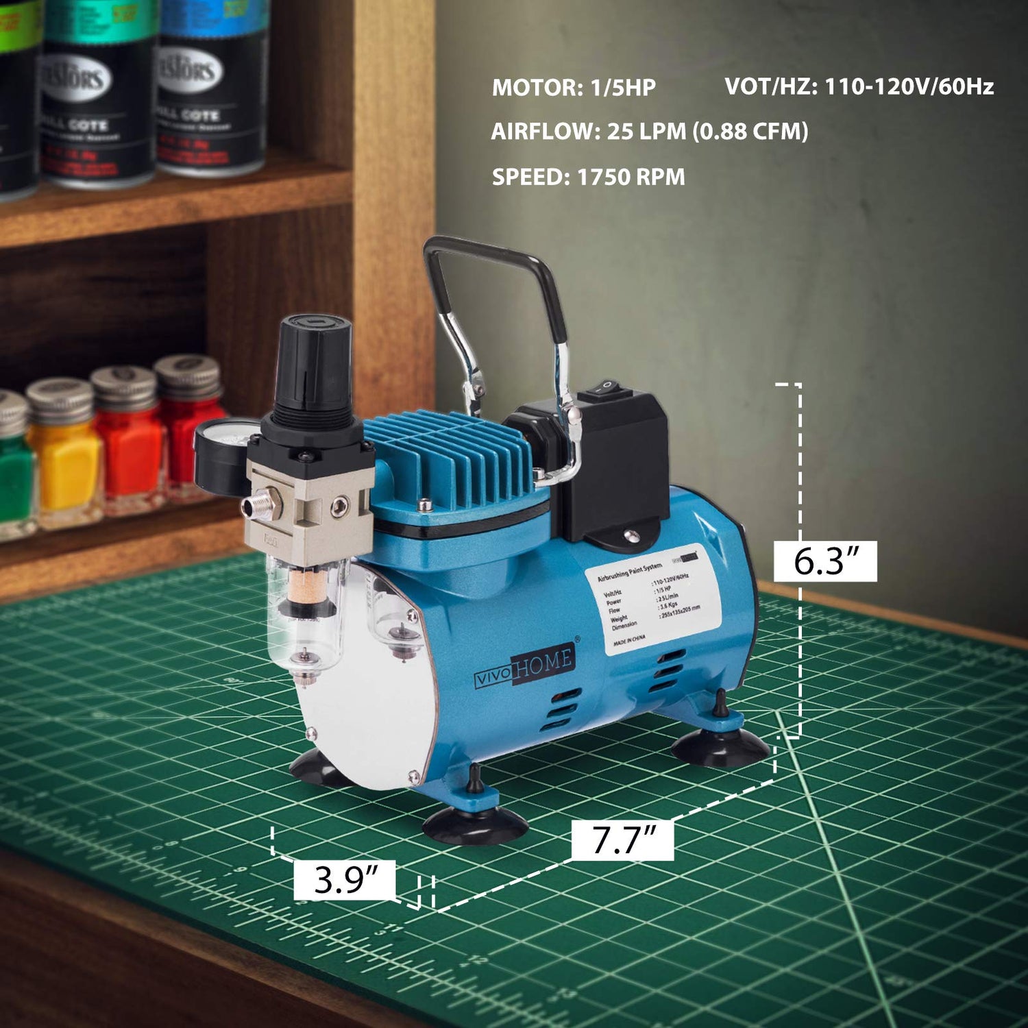 - WELL-EQUIPPED - Comes with a compressor-mounted airbrush holder that can accommodate two airbrushes; 1/5HP air compressor with air filter water trap delivers 23-25L/min airflow and 0.8cfm air volume; It is light-weight, compact and easy to carry around with the handle; It can be put on desktop or placed under the worktable
