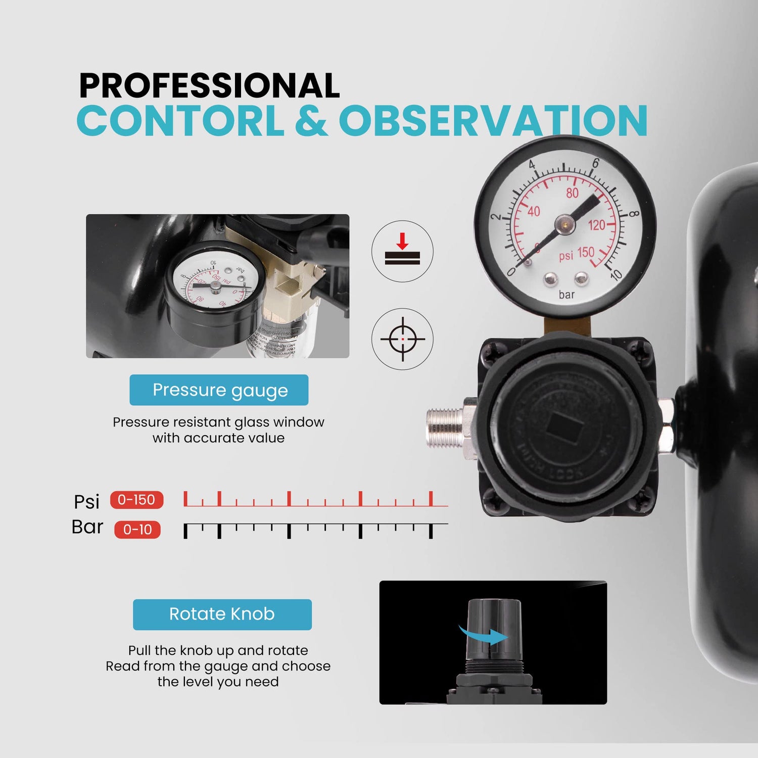 - IDEAL DESIGN - The portable handle is convenient for you to carry the machine with you; The gauge makes it easy for you to monitor your air tank’s real-time status; The compatible design allows you to choose different airbrushes according to your needs; The matte black color resists fingerprints or marks