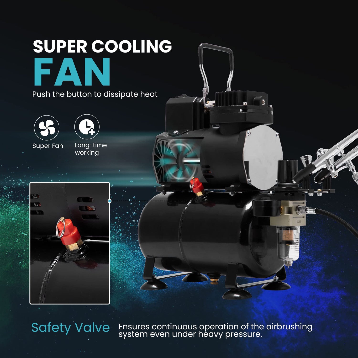 - PROFESSIONAL GRADE - This airbrush system runs with continuous, powerful pressure; It will turn off automatically if the motor is close to overheating; The powerful and quiet cooling fan will dissipate the heat to protect the machine so that you can work with it for a long time