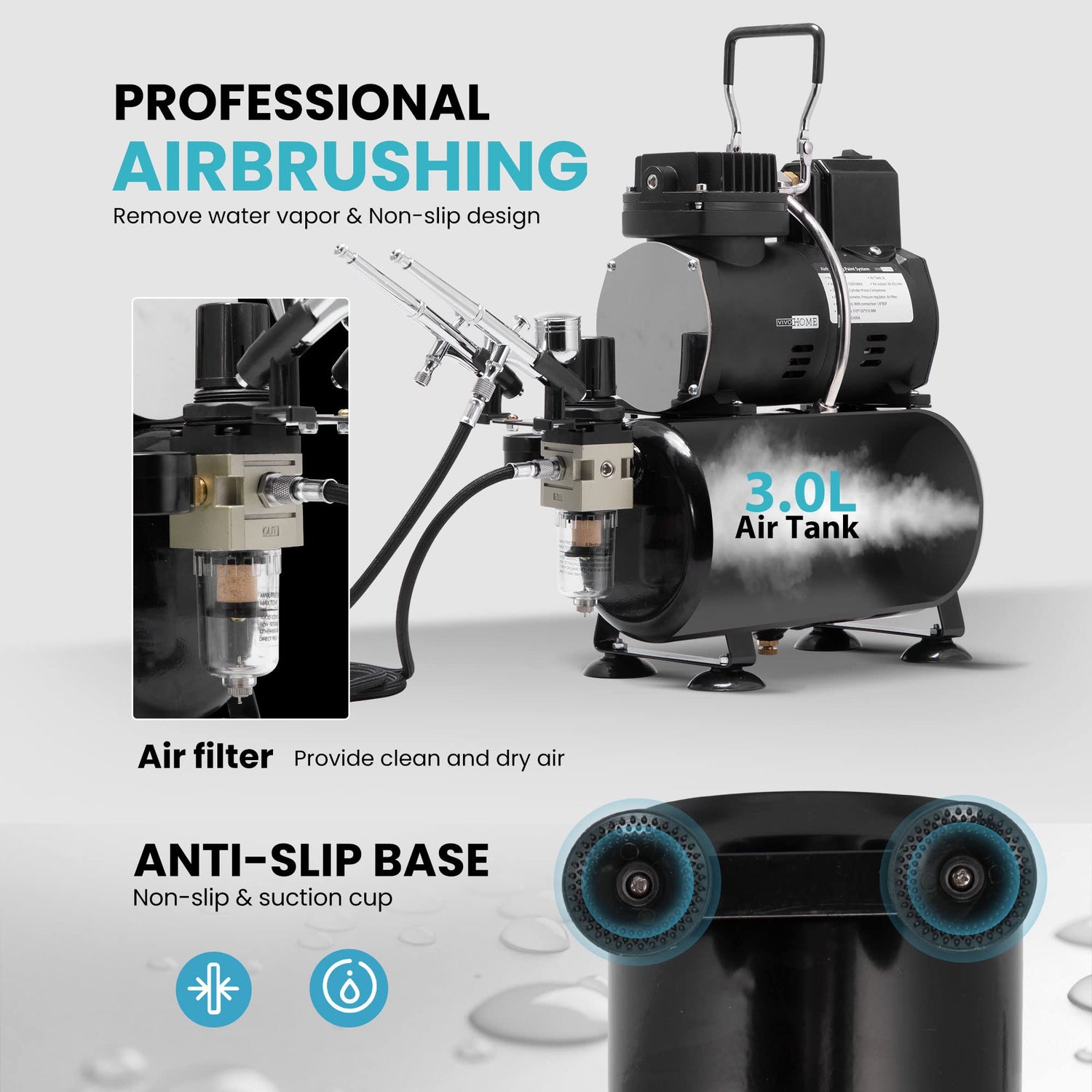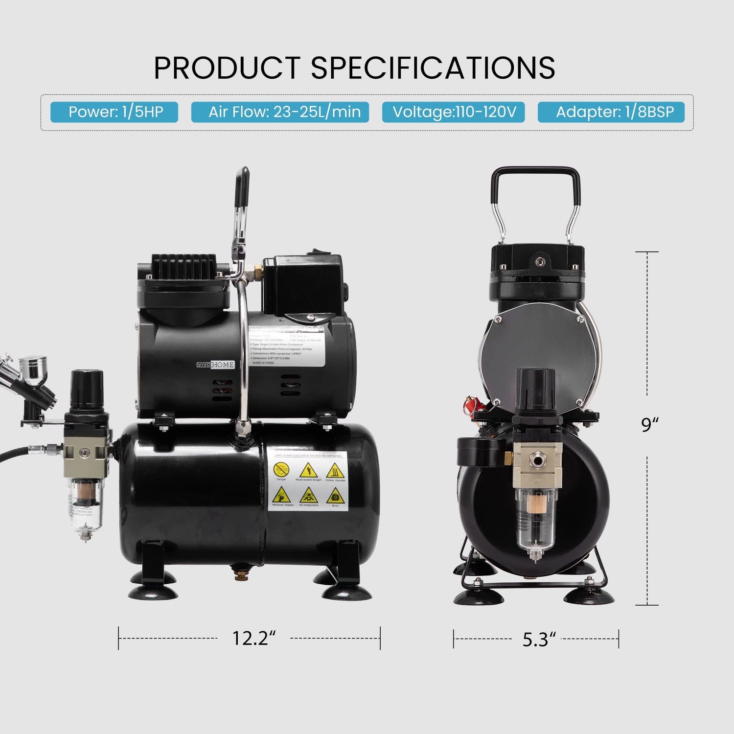 - HIGH PERFORMANCE - The unique, well-crafted equipment enables this air tank airbrushing machine to deliver top-notch painting performance; Secured by a classic piston framework, pressures are steady and sufficient, keeping a stable air output; The machine works in a low noise of 47 dB, and is oil-free