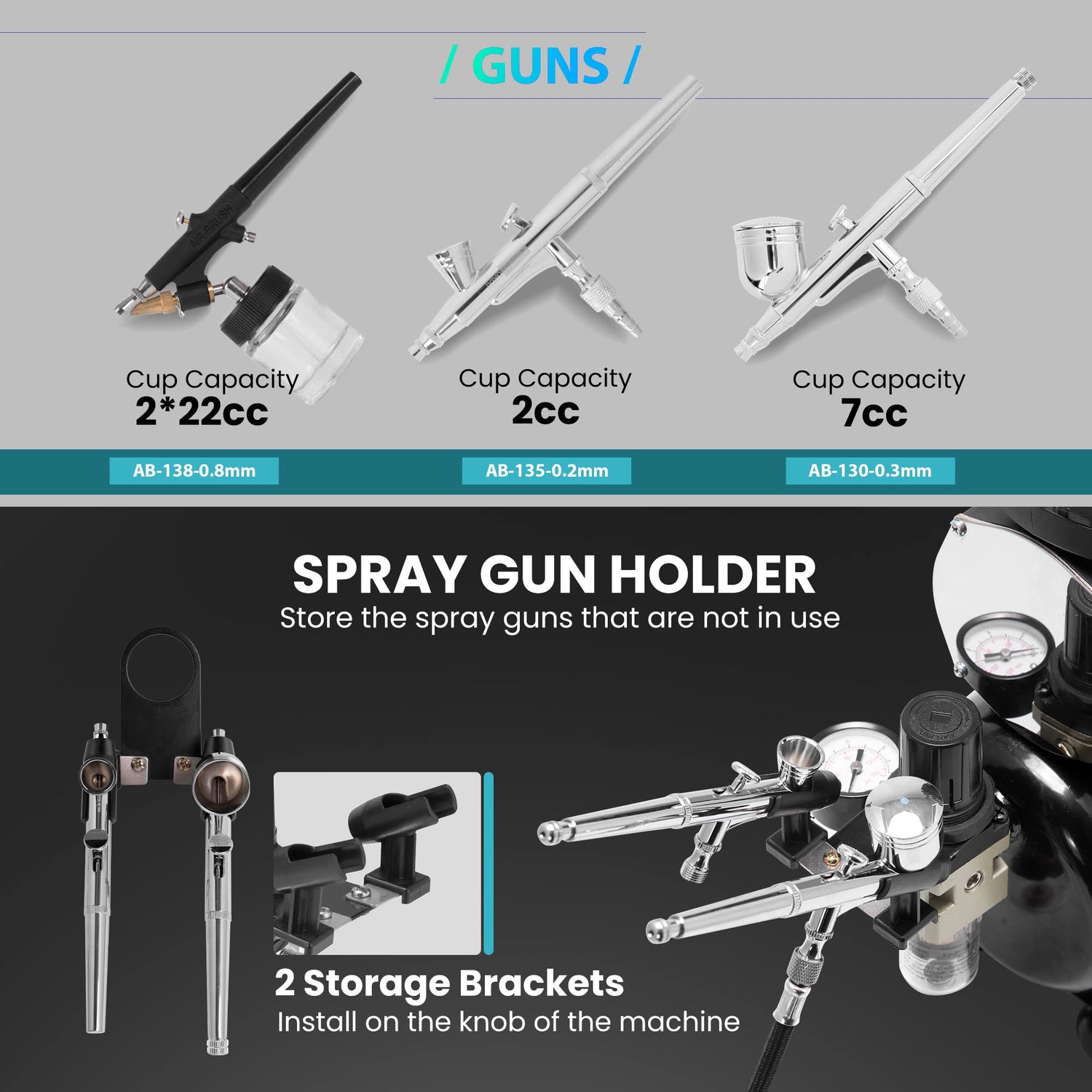 - COMPLETE ACCESSORIES - This dual fan airbrushing system kit comes with a compressor-mounted airbrush holder that holds 2 airbrushes; Use a PP package to prevent airbrushes from damage; A 1/5 HP air compressor with air filter water trap delivers 23-25L/min airflow and 0.8 cfm air volume, can spray cleanly and evenly
