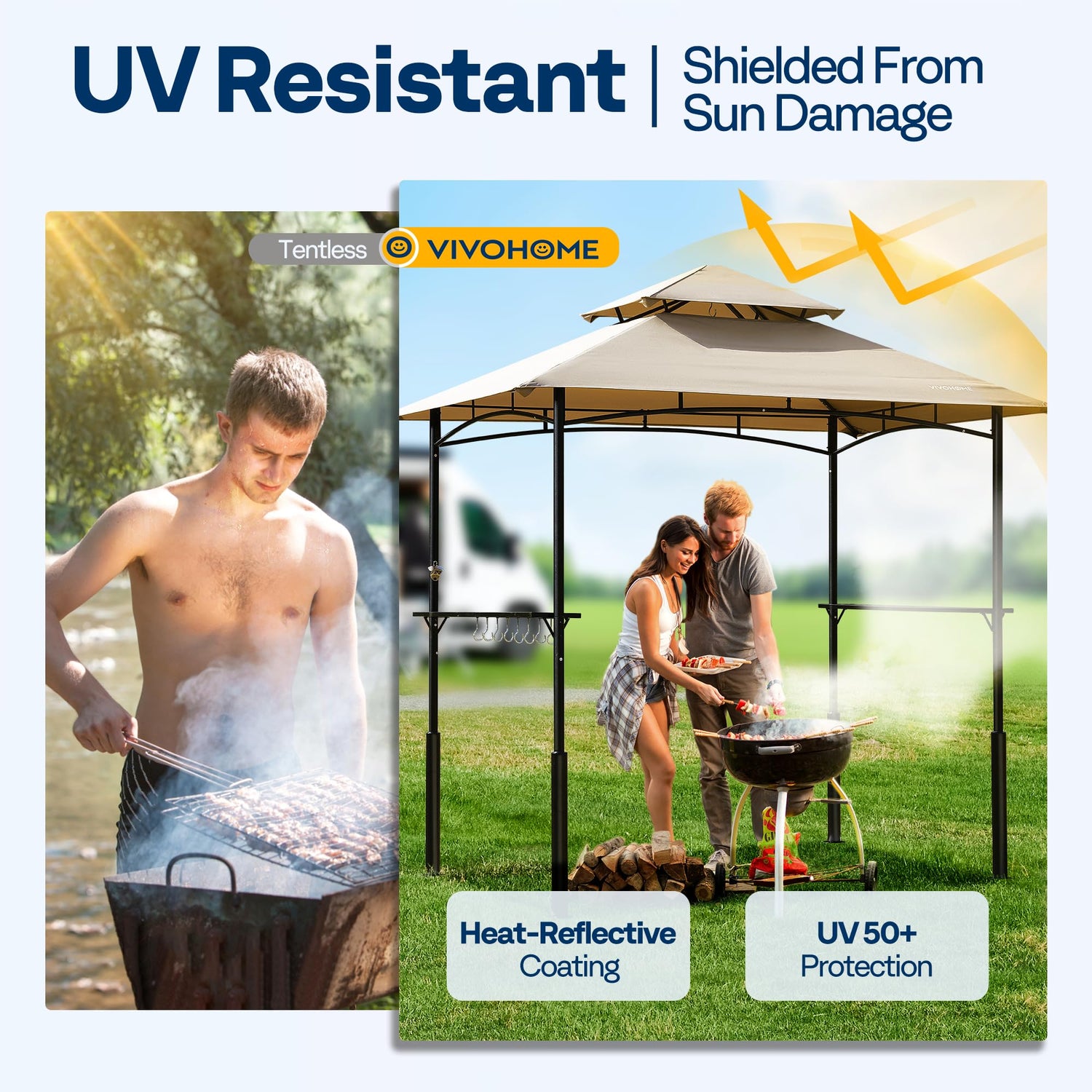 - SPACIOUS & SHADED COMFORT: The VIVOHOME Grill Gazebo Canopy (8' x 5' x 8.2') provides plenty of space for 6-8 people, keeping your BBQ gatherings cool and shaded for your BBQ gatherings. With its wide coverage, it keeps everyone cool and comfortable, whether you’re grilling or socializing; Designed to protect both your grill and guests, it’s the perfect addition to enhance your outdoor cooking and entertaining experience