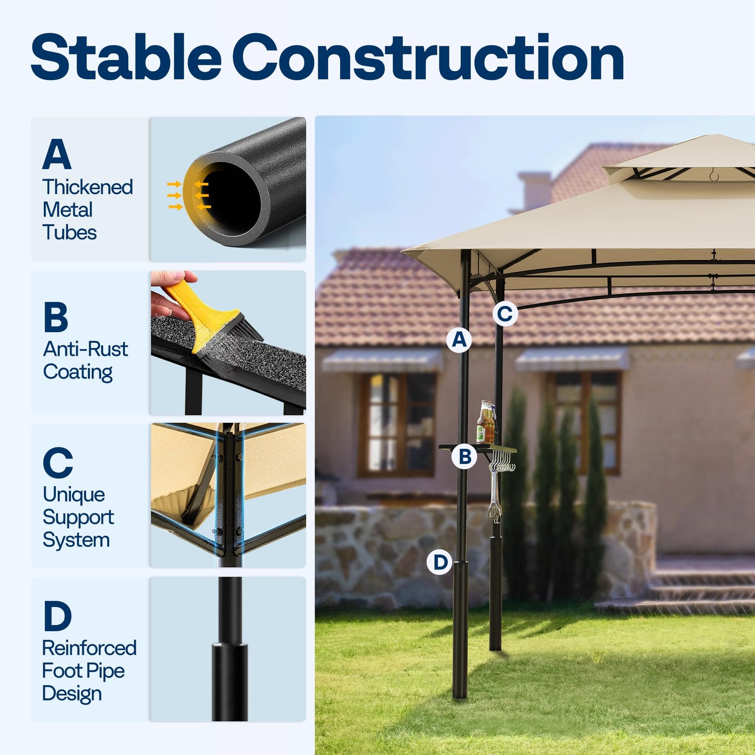 - HEAVY-DUTY STEEL FRAME, RUST-RESISTANT: The VIVOHOME Grill Gazebo Canopy features a durable powder-coated steel frame that is both rust-resistant and built to last; The frame’s reinforced construction ensures your gazebo stands firm and secure, even in windy conditions; To further enhance stability, the gazebo includes reinforced, thickened feet, offering extra support to withstand changing weather; Whether in sun or wind, you can rely on the sturdy frame for long-lasting use