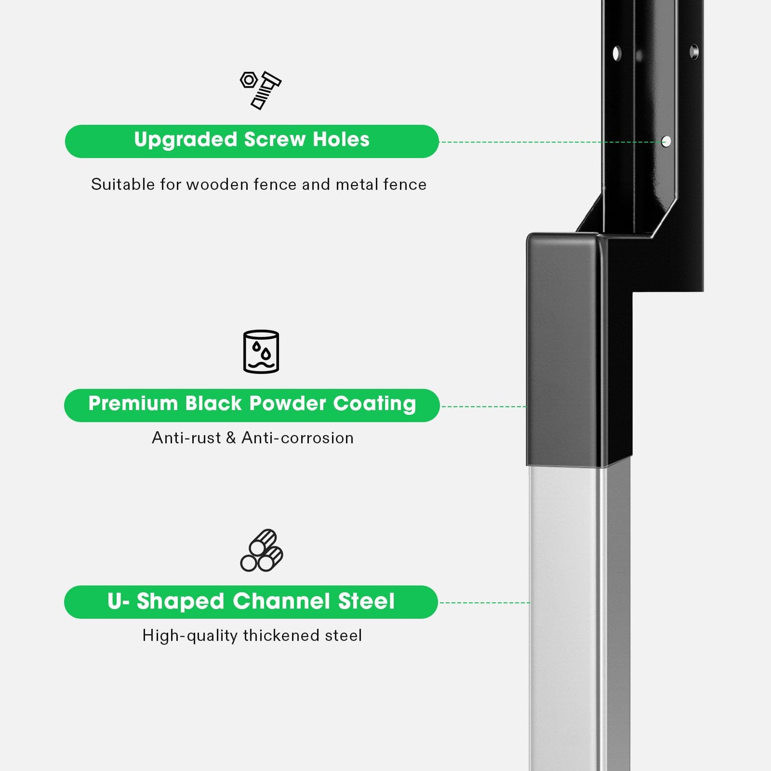 - Fixed Angle Bracket: Triangular fixed angle bracket enhances the overall firmness and strength of the structure; U-channel steel guarantees long-lasting performance, making the fence column anchor more stable