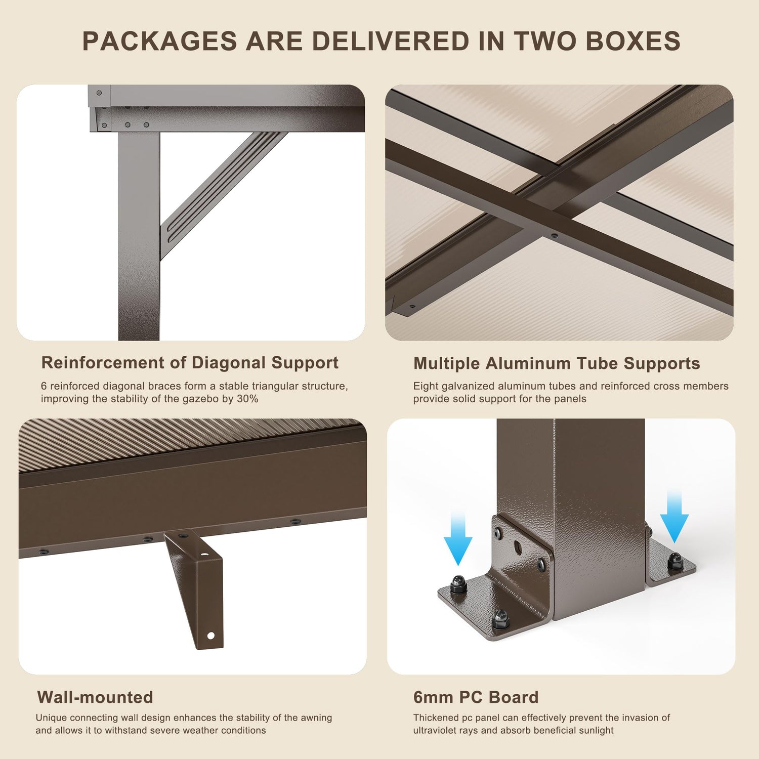 - Installation and After-Sales Service: VIWAT specializes in outdoor products and comes with a detailed installation instruction manual for wall-mounted gazebos. Our packages are shipped in two boxes and may not arrive at the same time. If any parts are missing or broken please contact us for replacement, VIWAT offers 24/7 service.