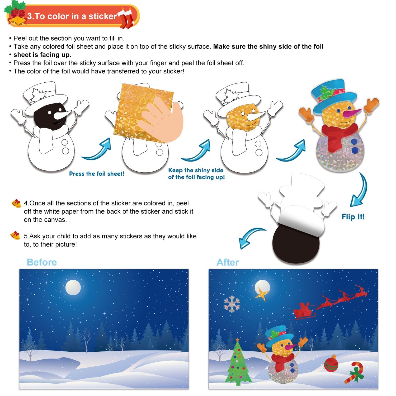 - Easy to Use:This Christmas fun foil art kits are easy to use.Follow the instruction,choose a picture canvas,select the Christmas stickers,press the sparkly foil sheets on it,then stick the colorful stickers on the picture canvas,enjoy endless fun with it