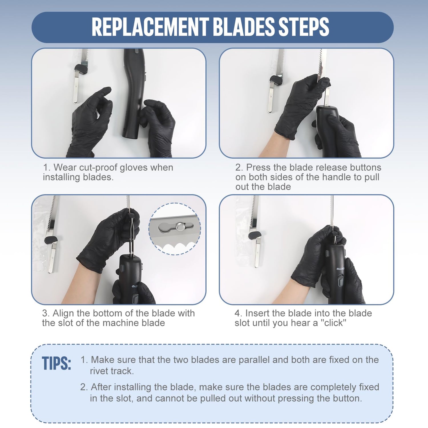 - Replacement Blade: This electric kitchen knife comes with a replacement blade. The blades are made of high-quality materials with good process characteristics such as corrosion resistance, heat fatigue, and thermal conductivity. It not only maintains the sharpness of the blade but also makes a breakthrough in durability and safety. Make the cooking process smoother and life in the kitchen better