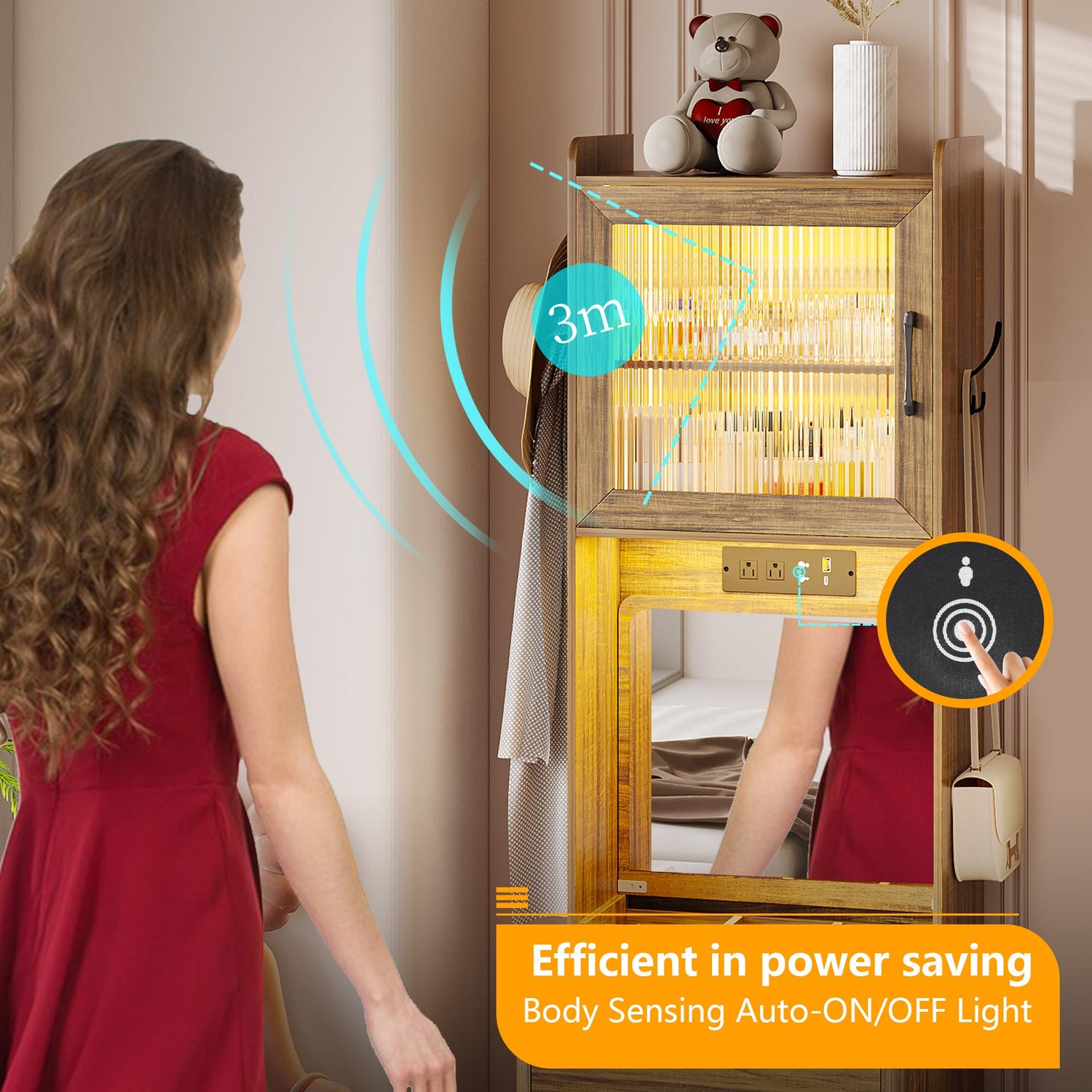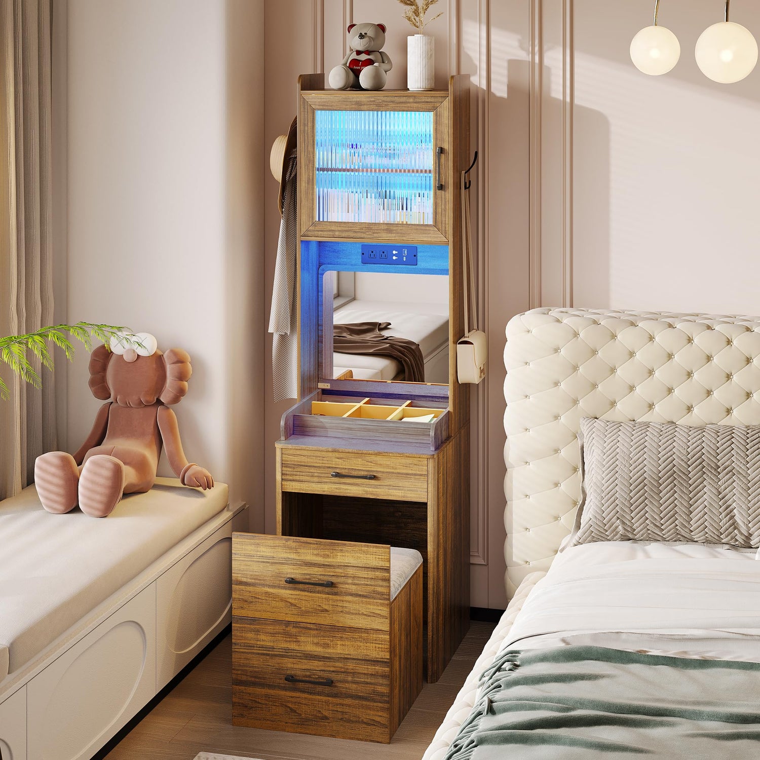 - Makeup Vanity with Lighted Mirror - The mirror can be hidden to better avoid dust contamination. With the mirror closed is a large tabletop and with the mirror open there is a jewelry storage space. Above the mirror is an upgraded light strip that allows you to switch color of the light or adjust brightness according to your needs. And you can also set the body sensor function, when you are close to the dresser within 3 meters will automatically light up