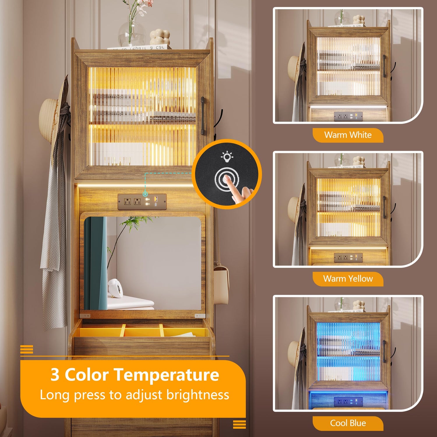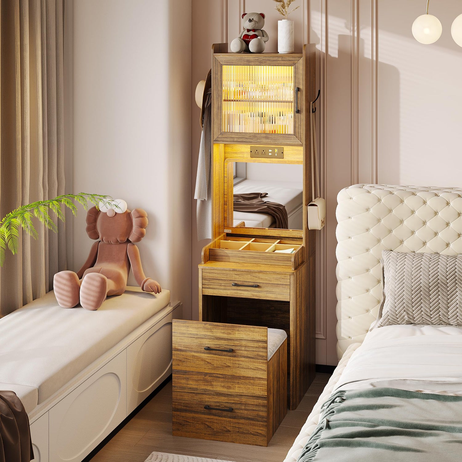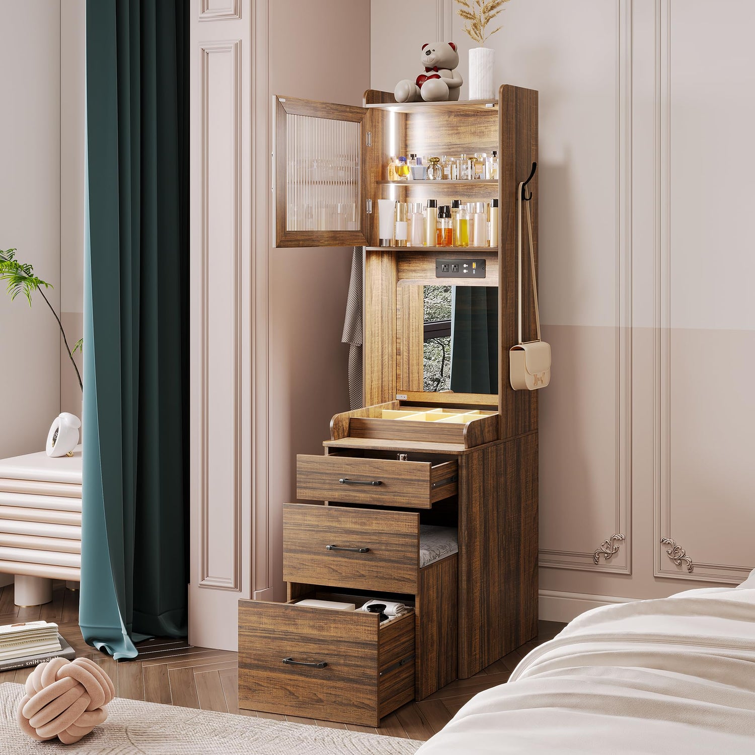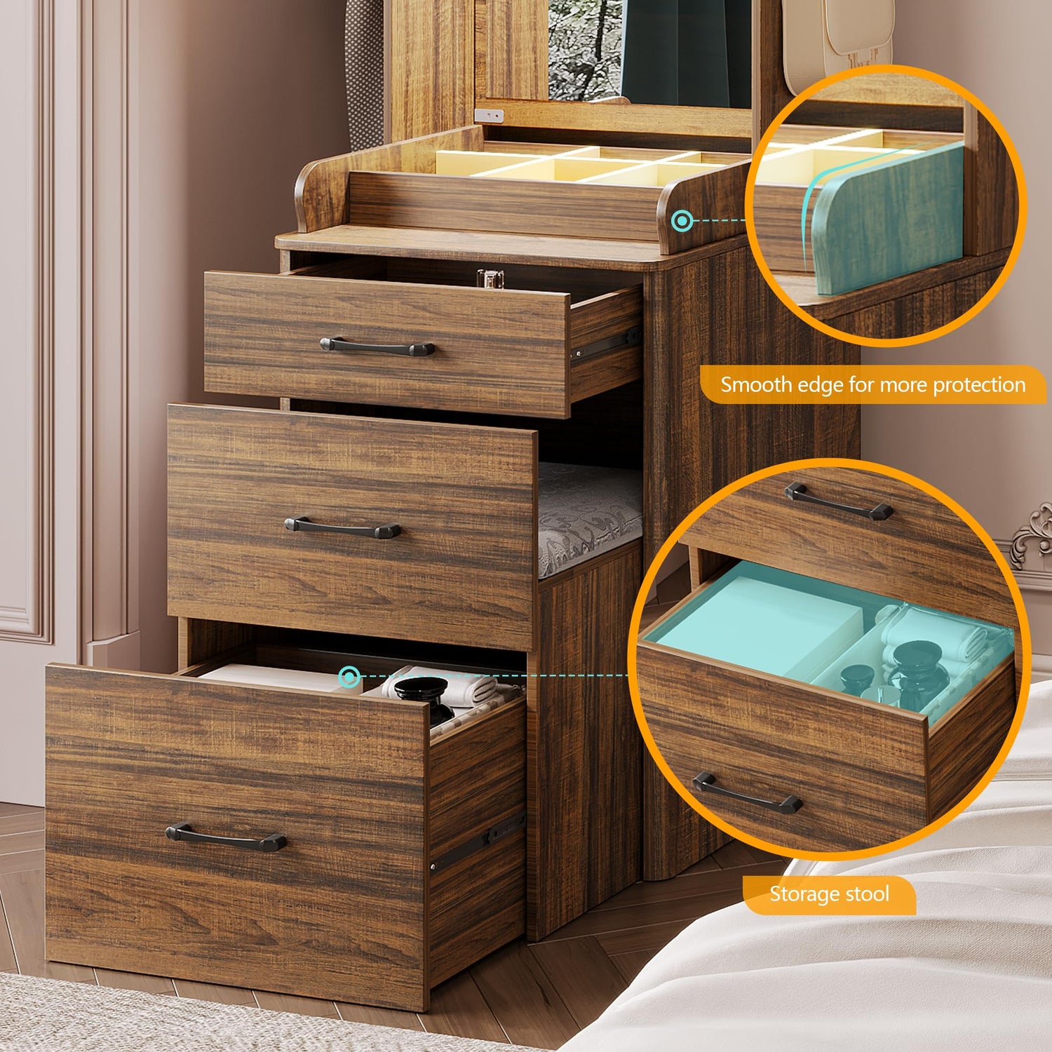 Vlsrka 70" H Vanity Desk with Mirror and Lights, Vanity Set with Hidden Stool, Drawers, Power Outlet, Makeup Dressing Table for Small Spaces, Brown