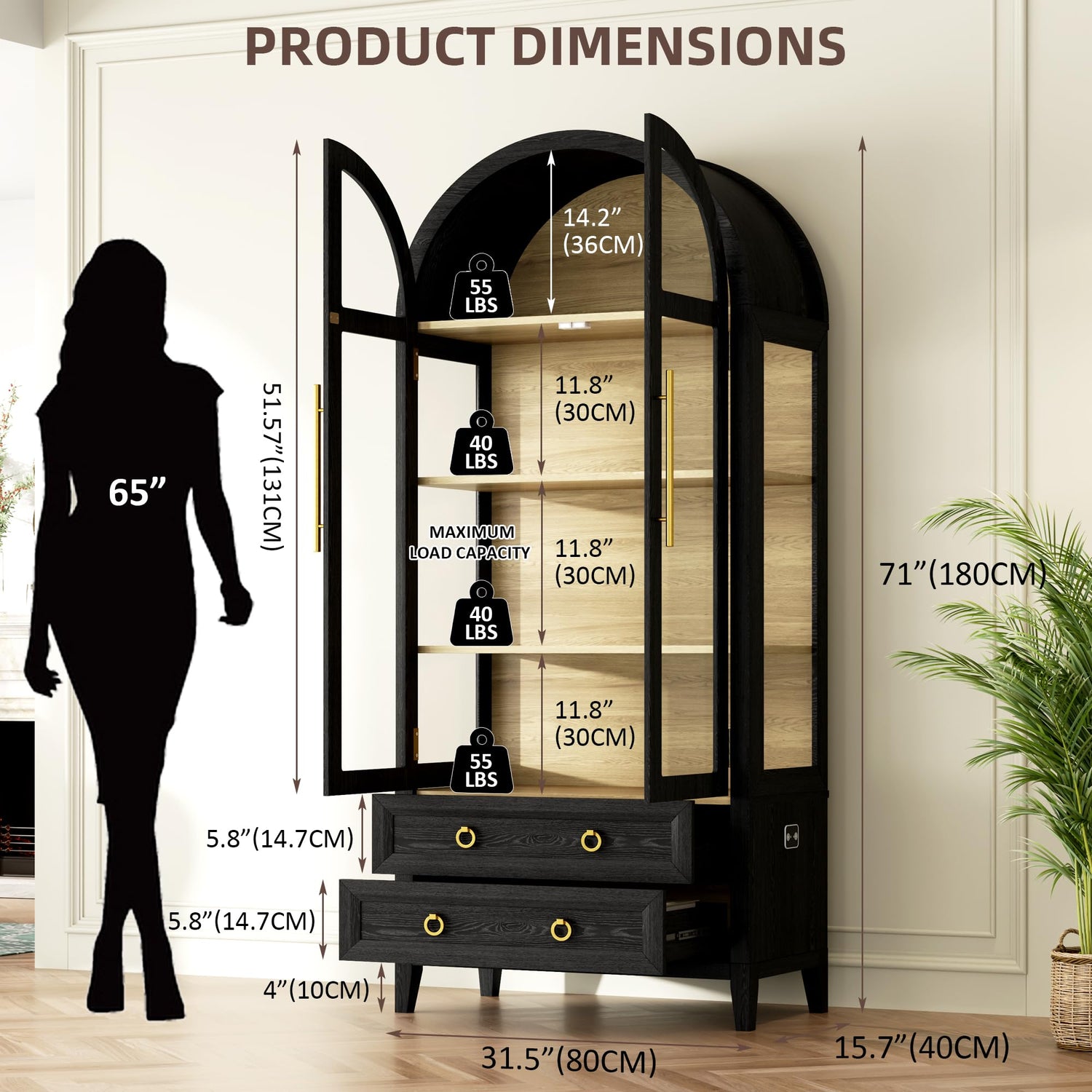 Vlsrka 71" Arched Curio Cabinet with Glass Doors, 4-Shelves Display Cabinet and 2 Drawers, Display Case with 3 Color Lights, Tall Bookcase, Kitchen Pantry, Black+Wood