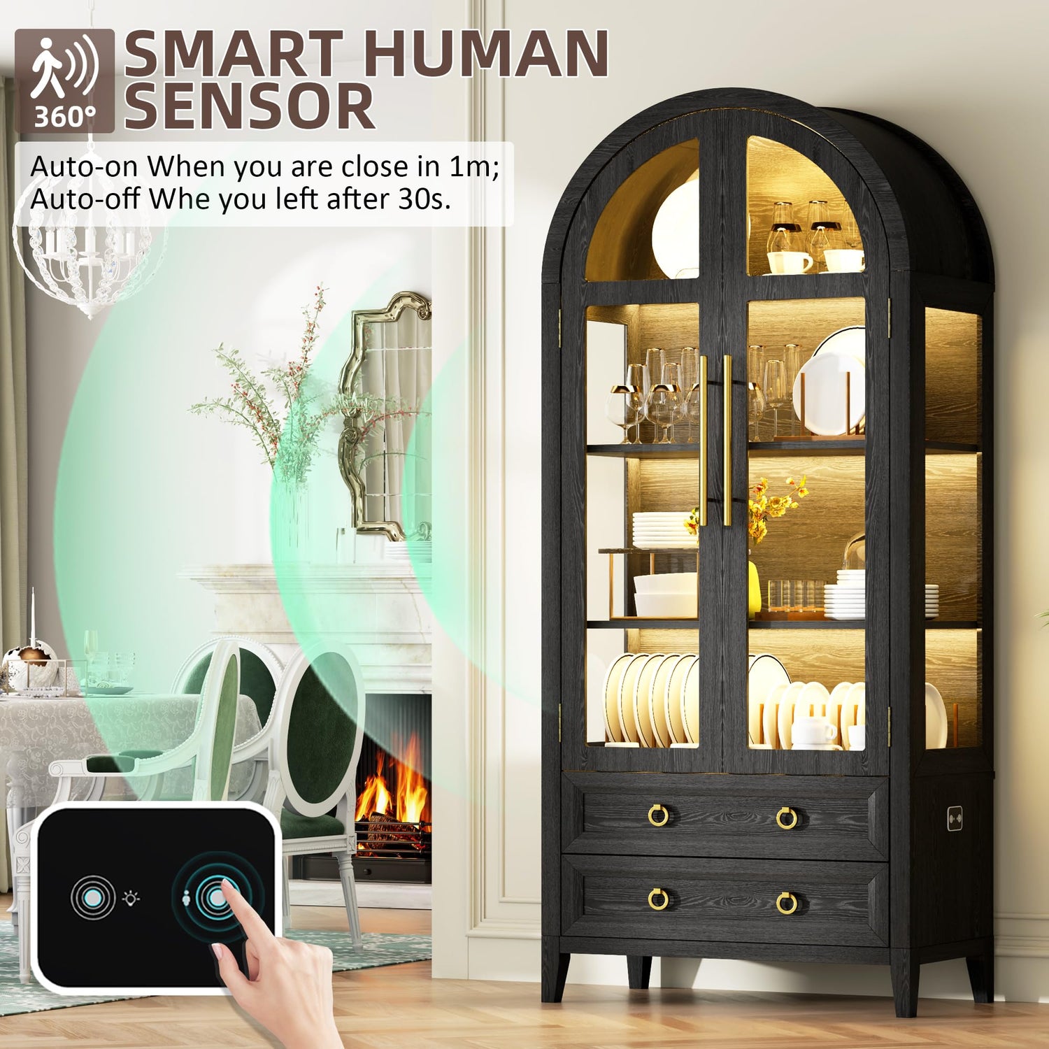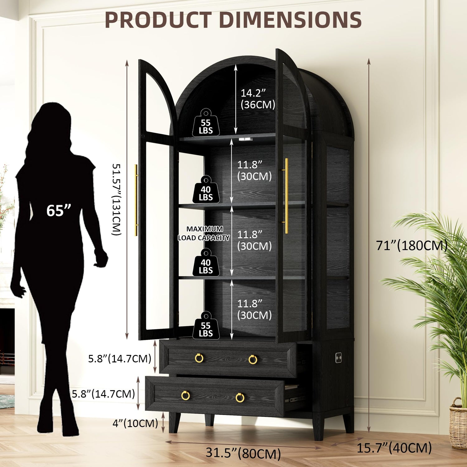 Vlsrka 71" Arched Display Cabinet with Glass Doors, 4-Tier Curio Cabinet with 3 Color Lights for Collectibles, Glass Display Case with Human Body Sensor, Display Shelf with 2 Drawers, Black
