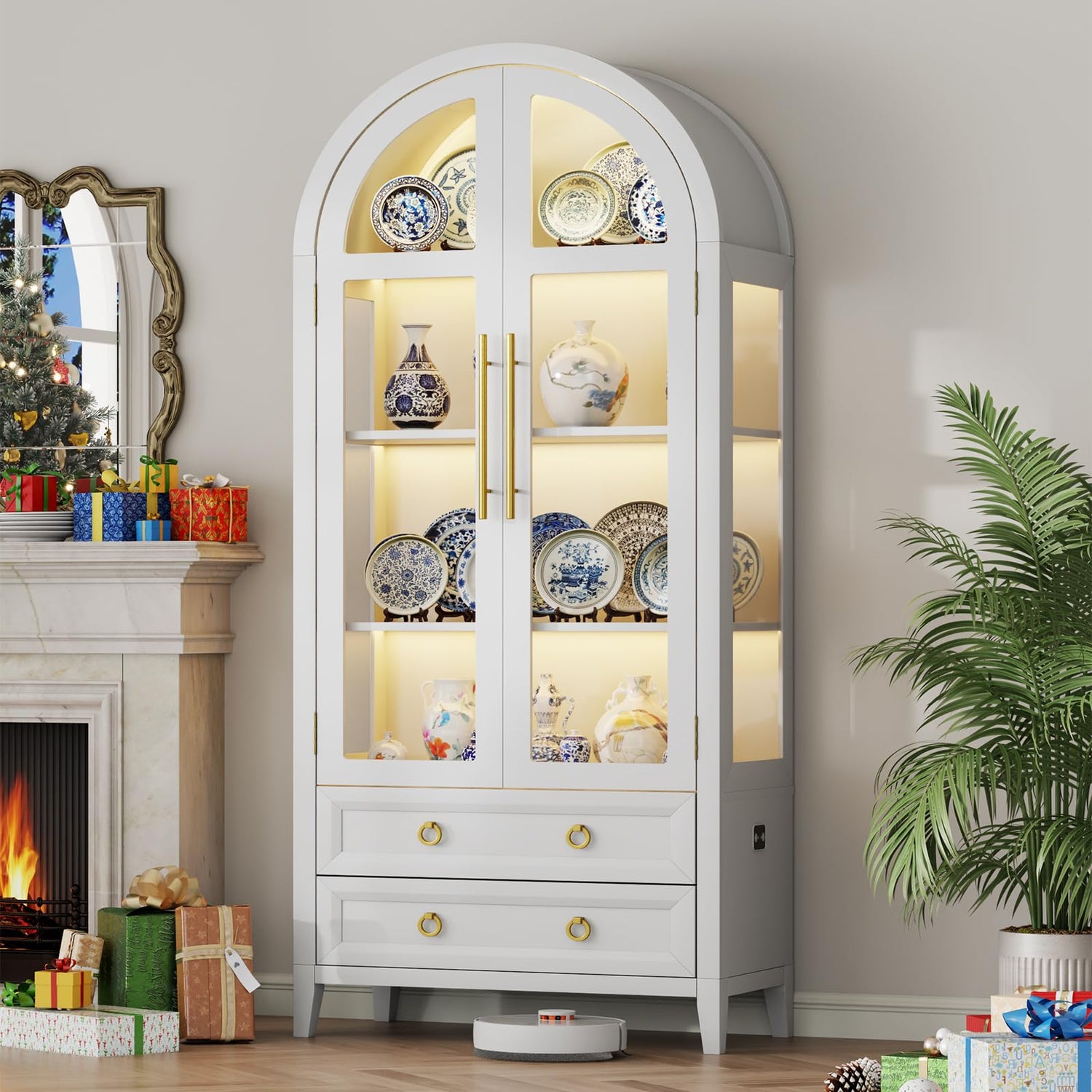 Vlsrka 71 Inch Arched Curio Cabinet, 4-Tier Display Cabinet and 2 Drawers, Tall Bookcase with 3 Color Lights, Display Case with Glass Doors, Kitchen Pantry, White