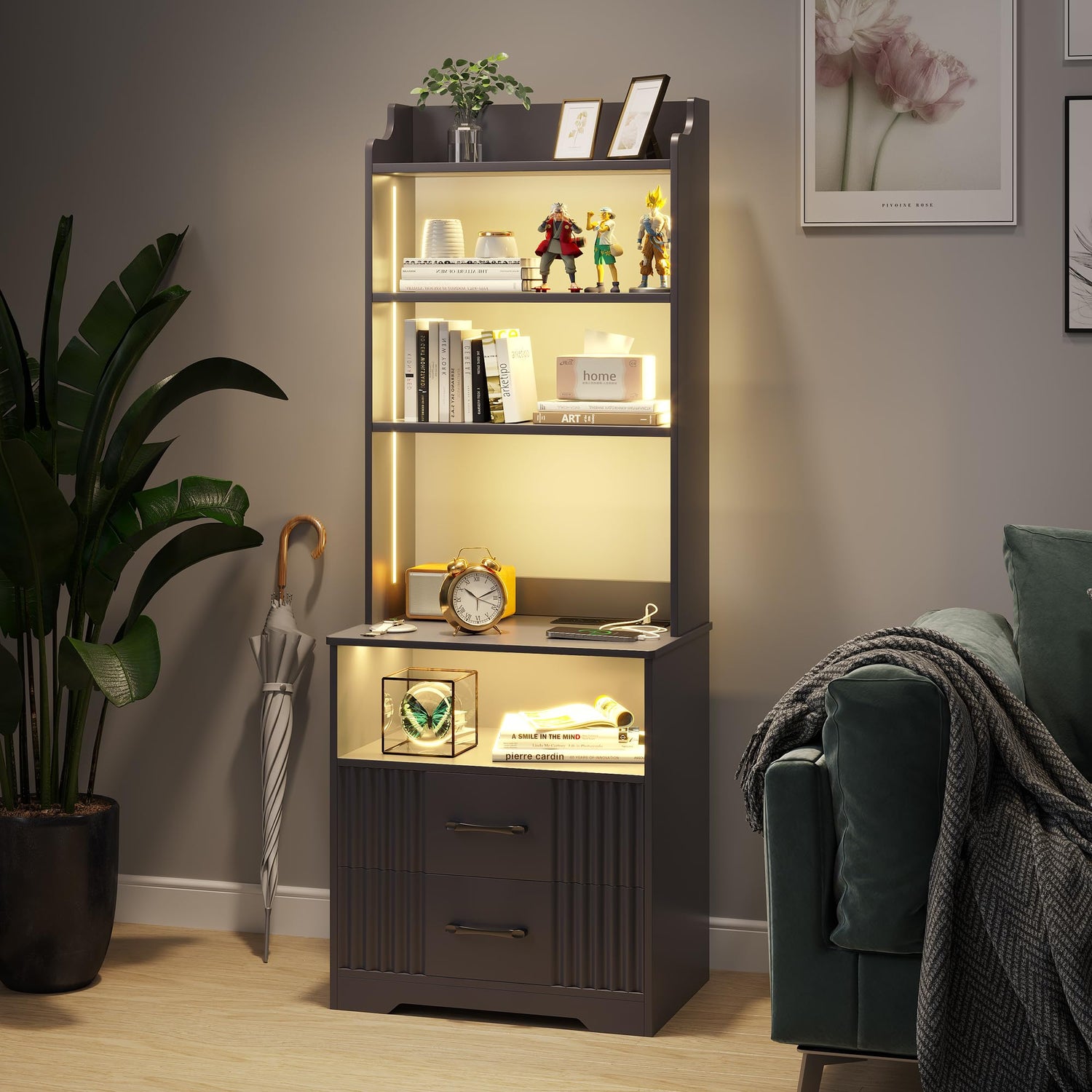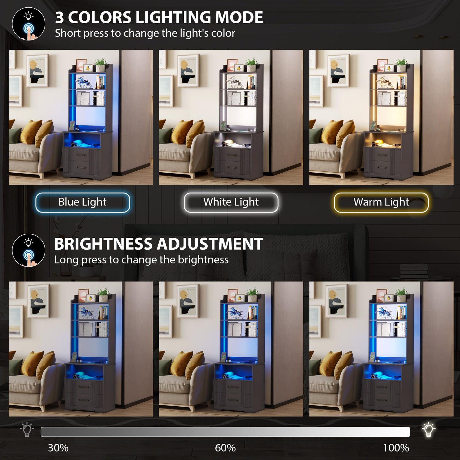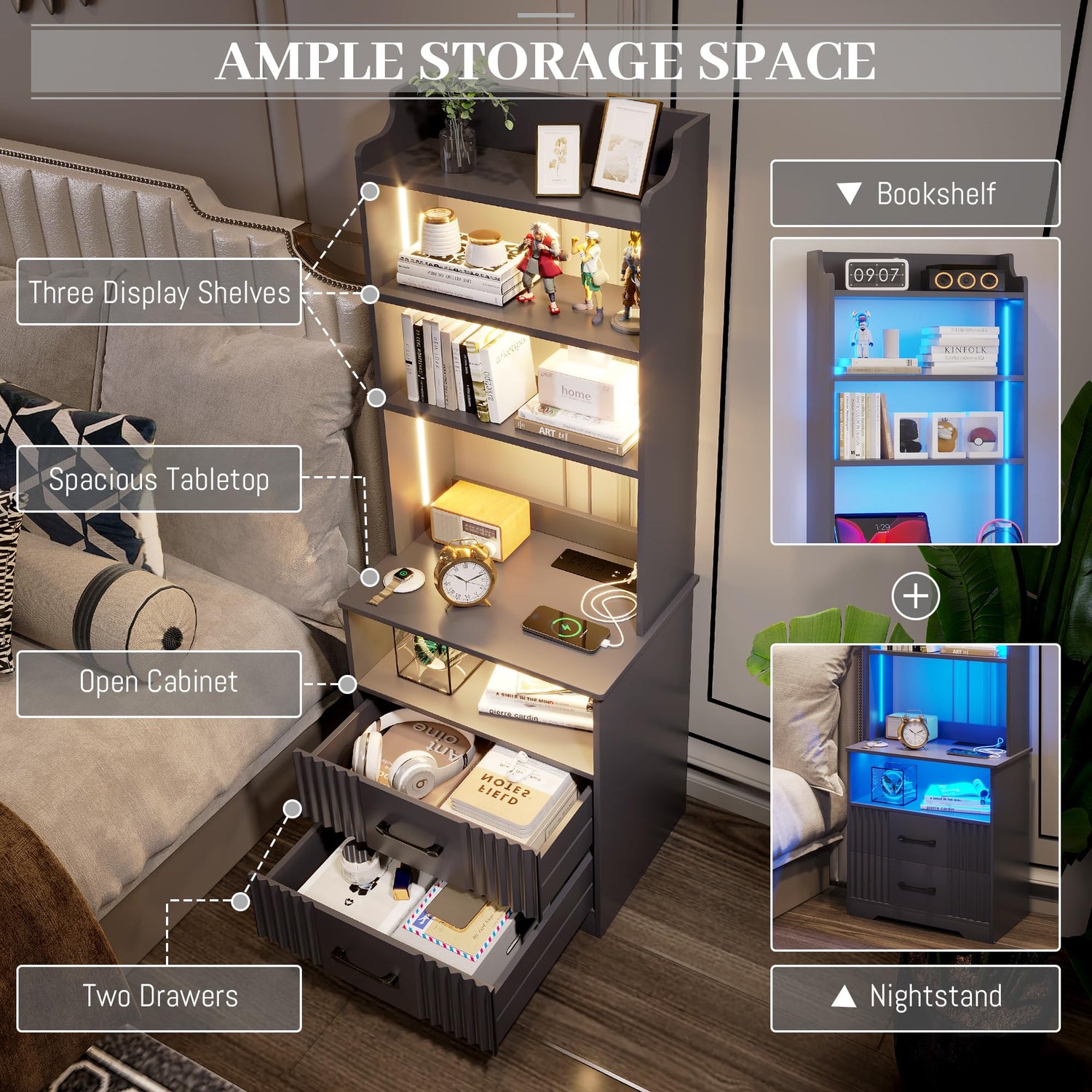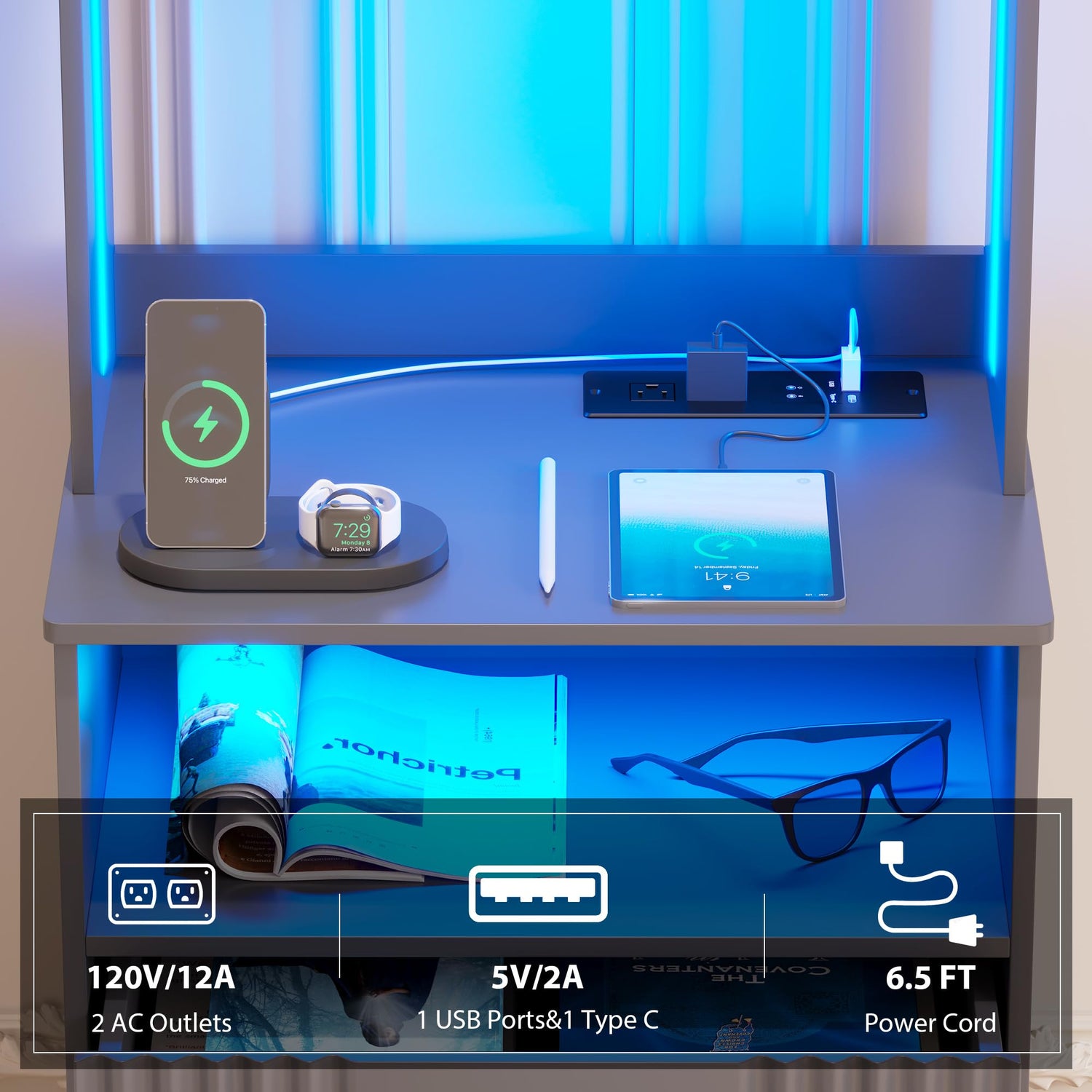 Vlsrka Smart Tall Nightstand with LED Lights and Charging Station - Modern Grey Bedside Table with Bookshelf and Storage Cabinet